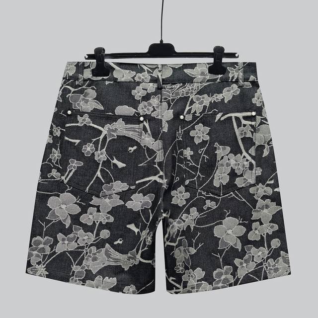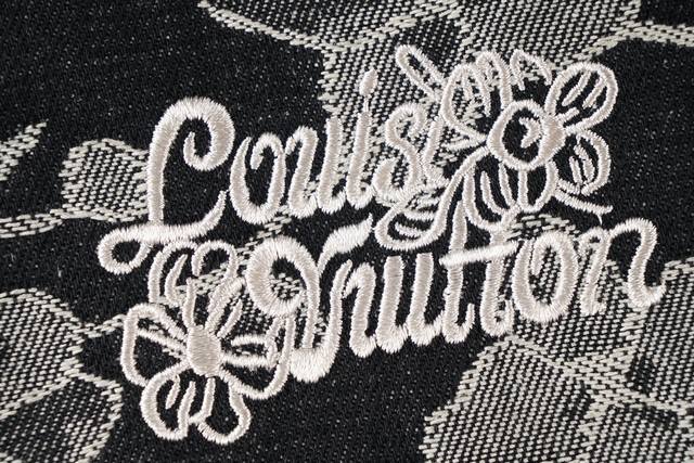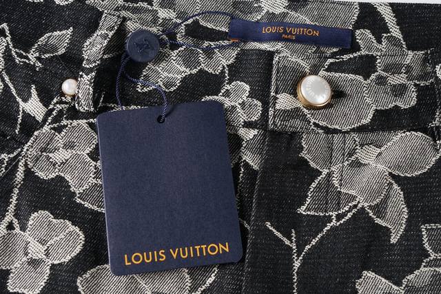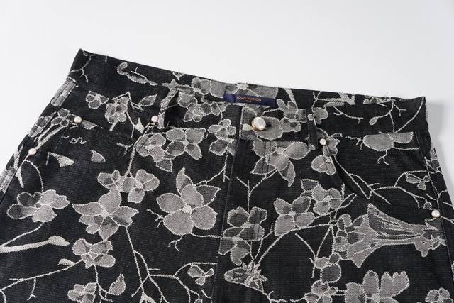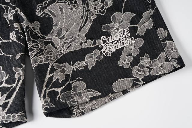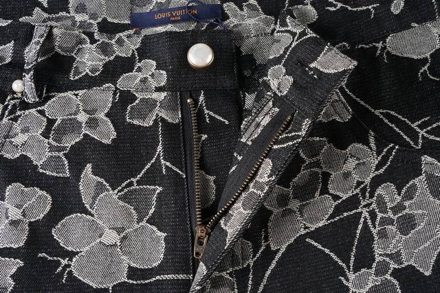 New DDD Denim Black Shorts in 1V Waves jacquard fabric, inspired by the collection's tropical surf paradise. The left leg features an embroidered 1V Flower logo, adorned with pearl buttons and studs, adding a touch of sophistication to this casual piece. Pair it with the matching shirt for an even more outstanding look. Original version is black, this is the correct version. DDD Waves all-over jacquard Ddd Embroidered flower pattern on the left leg Ddd Damier jacquard pattern on the back Ddd Five pockets Ddd Gold-plated pearl effect buttons Ddd Pearl earrings DDD Indigo Ddd Size X4 DDD
