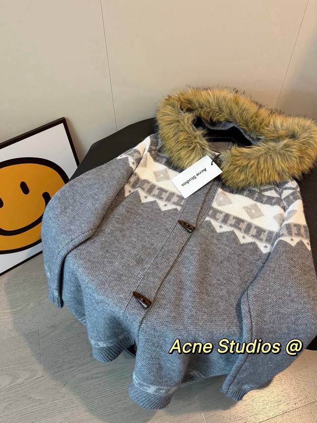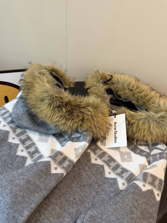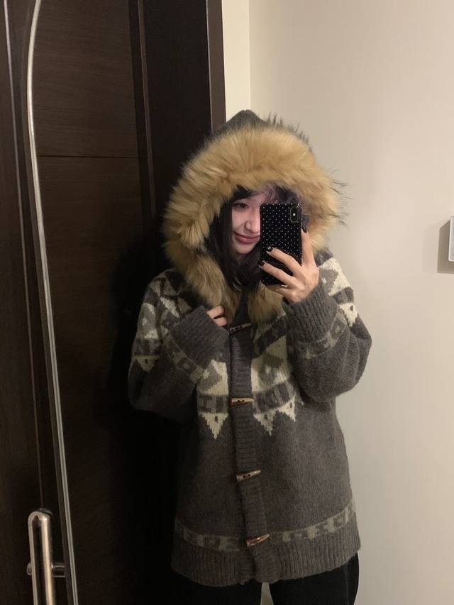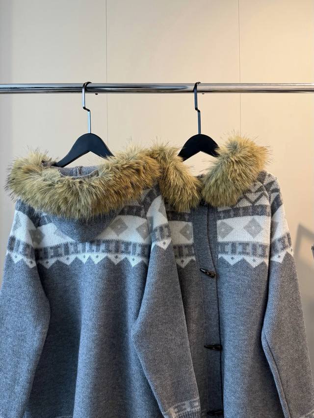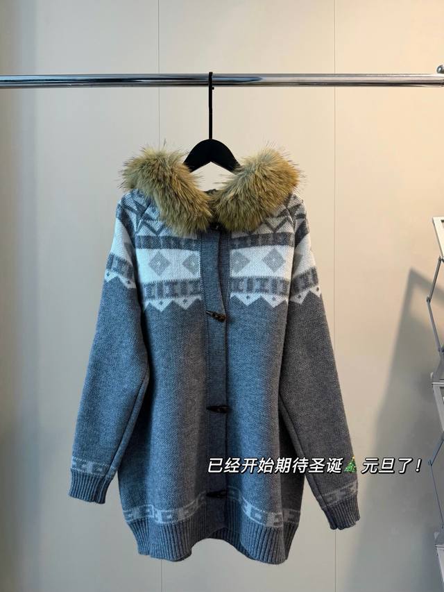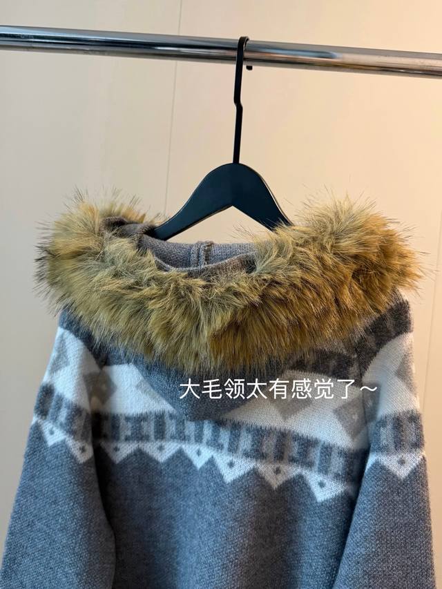New Fair Isle Series Fur Collar Knit Sweater with Horn Buttons, Thick Wool Coat