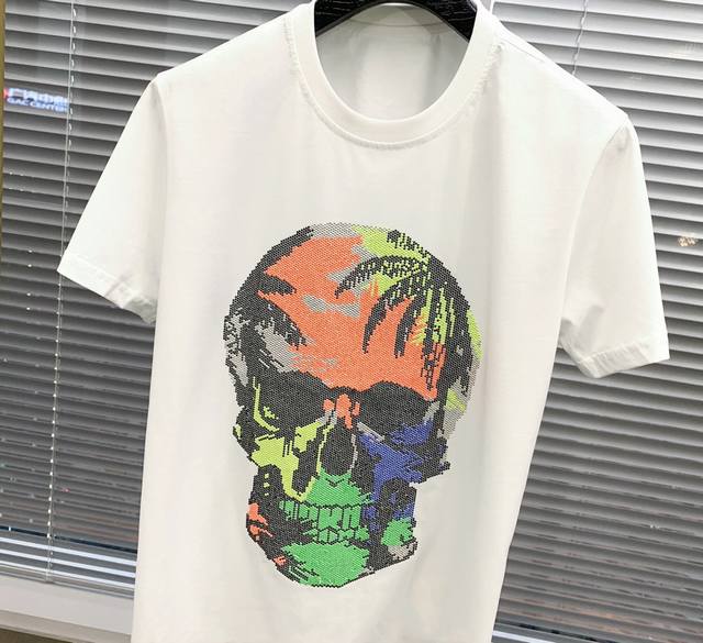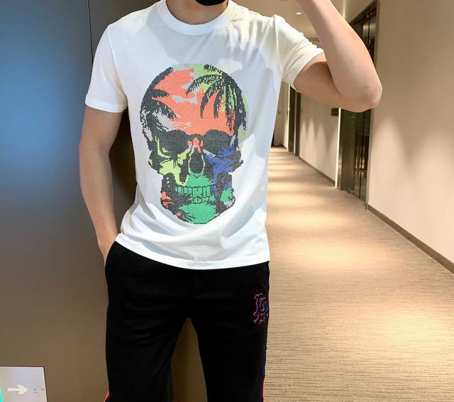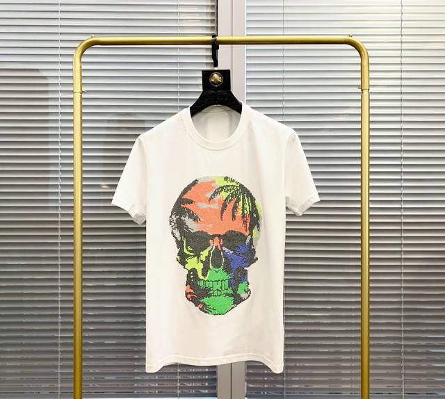 New short-sleeved shirt made of imported high-quality mercerized cotton, smooth and breathable, with a slim fit and a novel skull design embossed with top-grade Austrian diamonds. Hot selling item: Sizes M to XL.