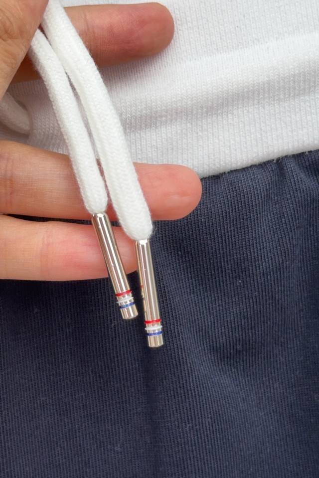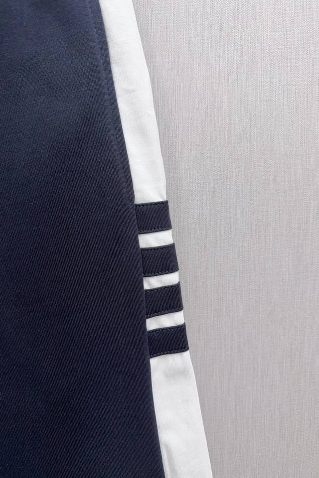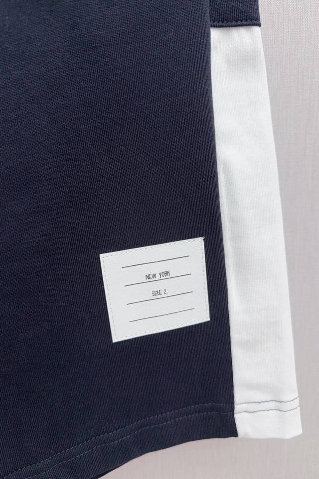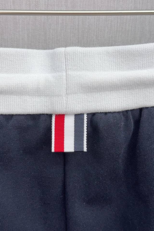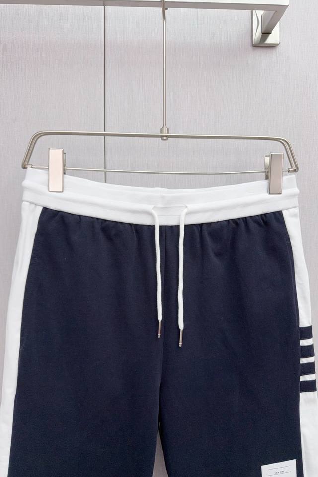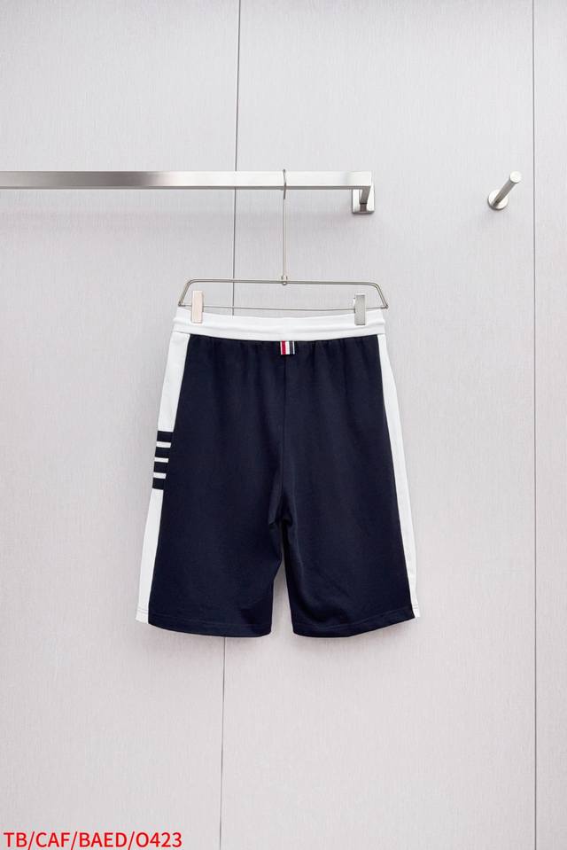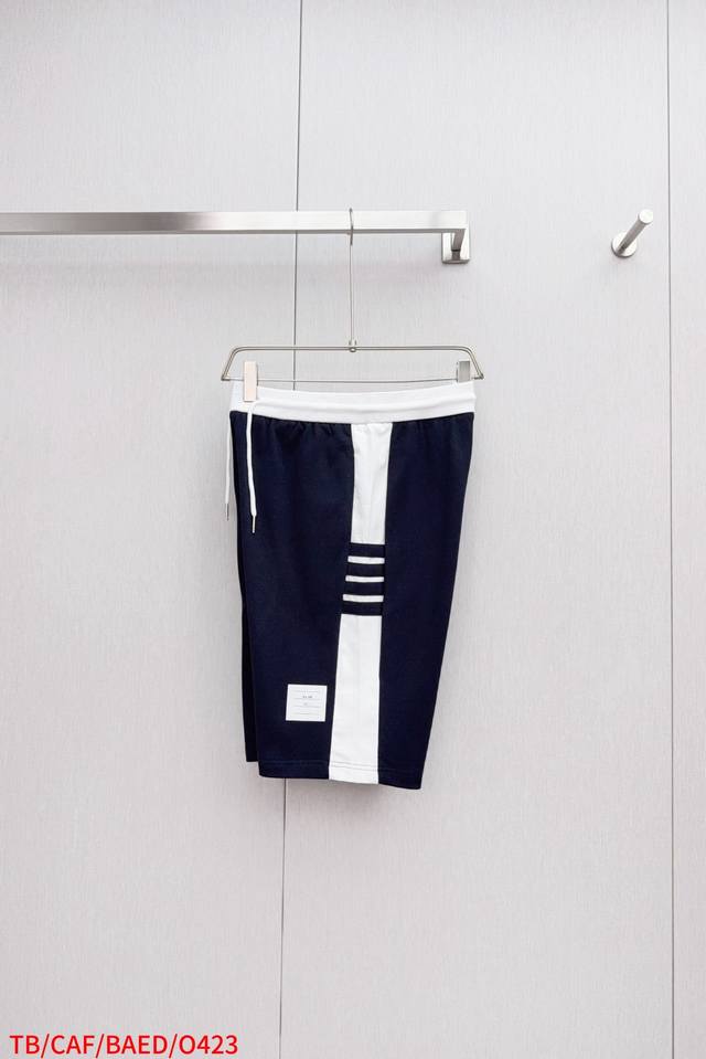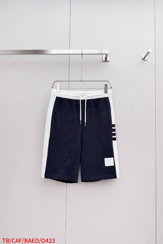 O423 Tb Color-blocked ribbed four-stripe casual shorts, 360g pure cotton fabric, custom pure cotton one-piece jacquard waistband, drawstring hardware that can rotate 360 degrees, high-end quality, bulk order, real photos. Sizes 1, 2, 3, 4, 5. Available in navy blue and light gray, all three labels included.