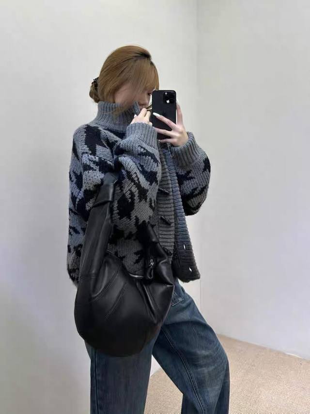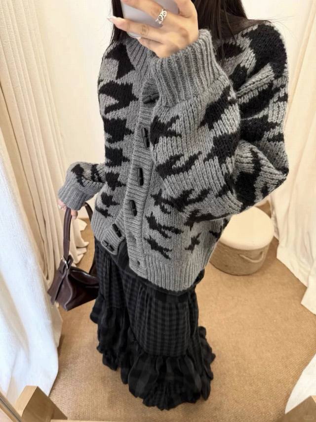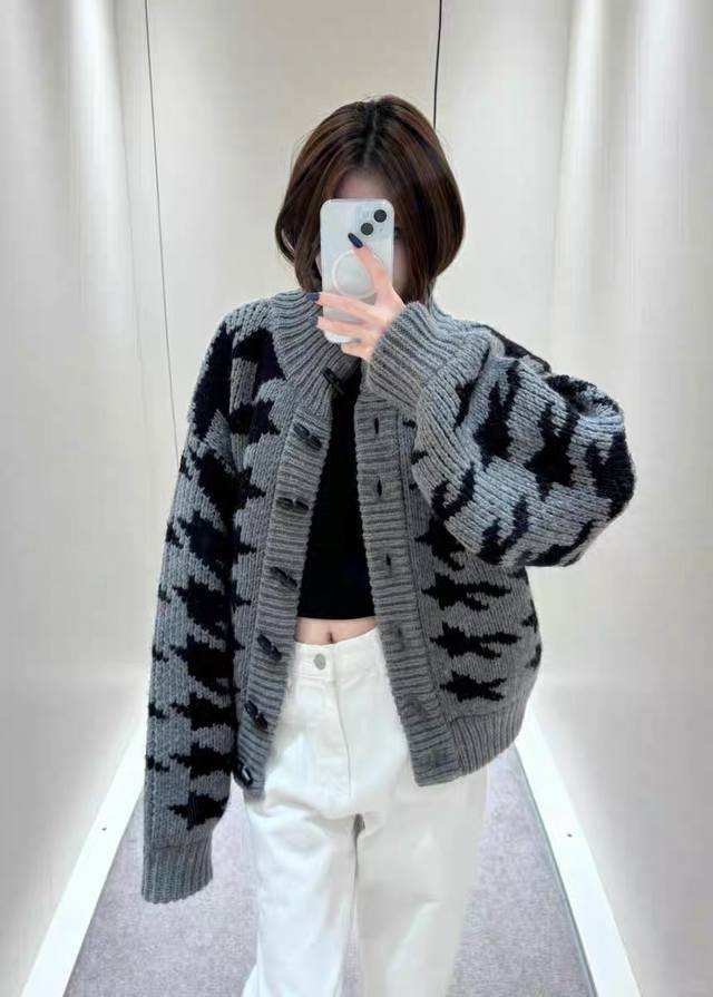 Open Yy 25Ss New Retro Houndstooth Horn Button Knit Stand Collar Sweater Cardiga