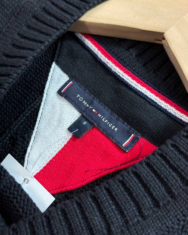 . A classic Tommy sweater, a must-have for fall and winter. This pure cotton round neck sweater features exquisite embroidery on a classic Tommy style! Simple, stylish, and elegant! Men always choose simple and elegant items! Available in a classic black and navy blue colorway! Wear it alone in fall or layer it under for warmth and comfort in winter. While enhancing the quality, it also adds a soft and comfortable feel to the top, creating a truly refined feel! The sweater is hand-washed for a soft, durable feel. The collar and cuffs are custom-made with a jacquard pattern. The chest embroidery is made with imported machinery, creating a delicate, full, and three-dimensional effect. Complete with all three labels