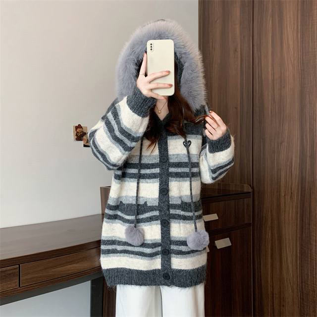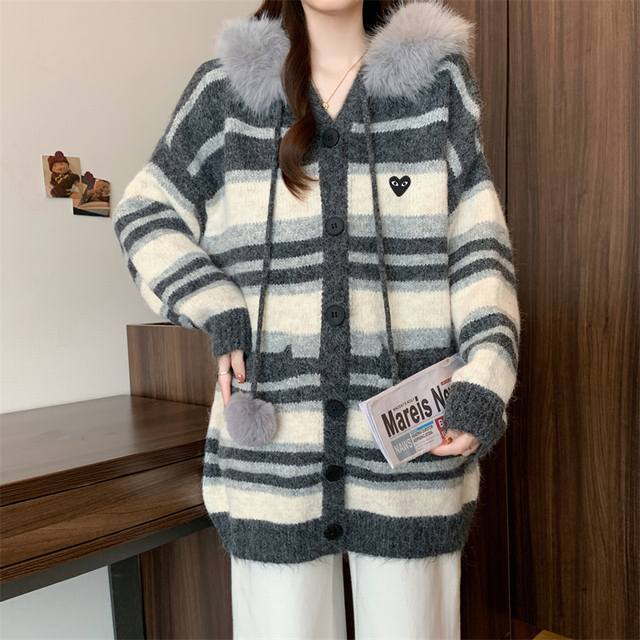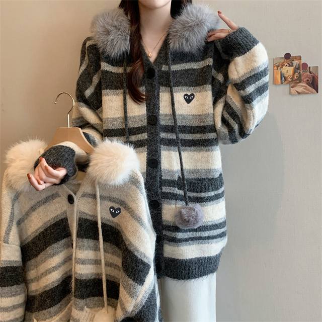 Play Comme des Gar?ons ( Rei Kawakubo) Help! This striped cardigan from Comme des Gar?ons is so effortlessly chic and has that Korean-style relaxed vibe! Anyone understand?! I've found a treasure from Comme des Gar?ons for Fall/Winter! This hooded striped knit cardigan perfectly balances sophistication and a youthful look. The loose fit is flattering and slimming. I wore it to a cafe or Citywalk and got asked for the link 800 times! It instantly gives off a Korean leading lady vibe! Stripes are divine! It's not just any ordinary cardigan; it has a built-in filter of sophistication. I was initially worried that stripes would make me look older, but after wearing it, I was totally won over!