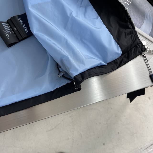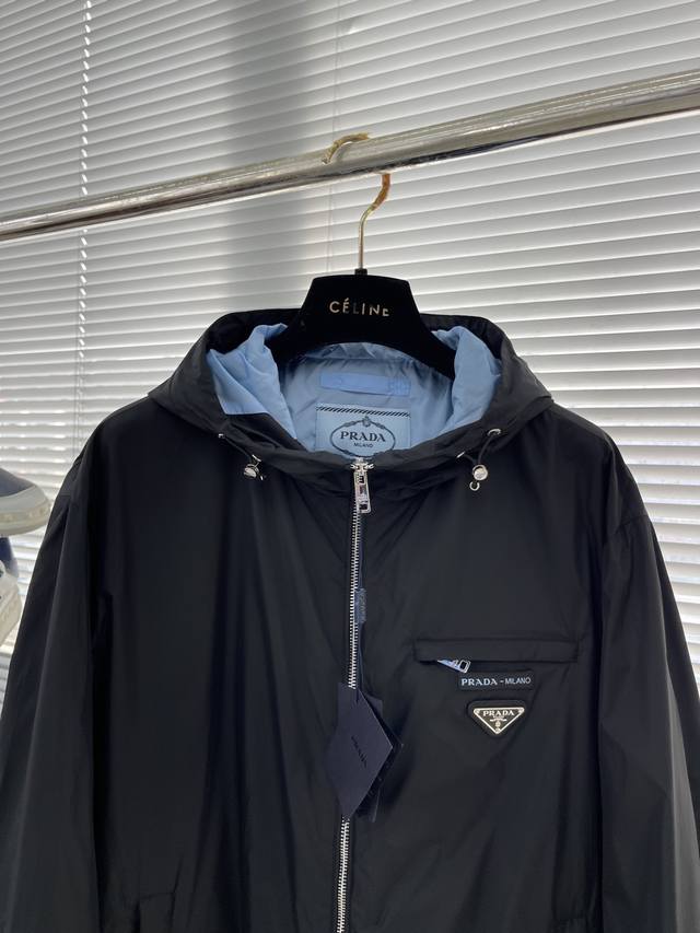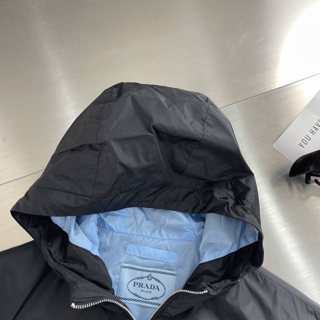 prad 25 New Arrival Hooded Jacket! Ddd First Come, First Served, Seize the Opportunity. Ddd New Hooded Windbreaker. This lightweight nylon jacket features a front zipper, black exterior and blue interior, with a casual design. It has a contrasting placket at the chest, showcasing the brand's style. Features include a hood, front zippered pockets with an enamel triangular metal logo, front zip closure, and polyamide fabric. Ddd Sizes: 48-56 M-3XL DDD