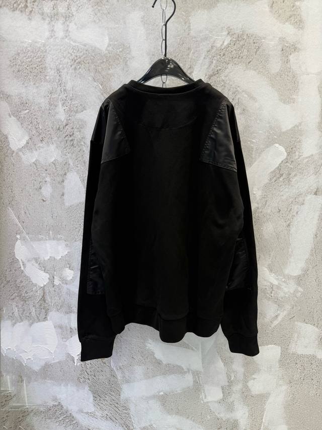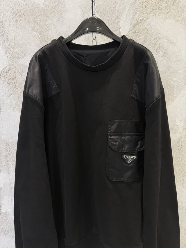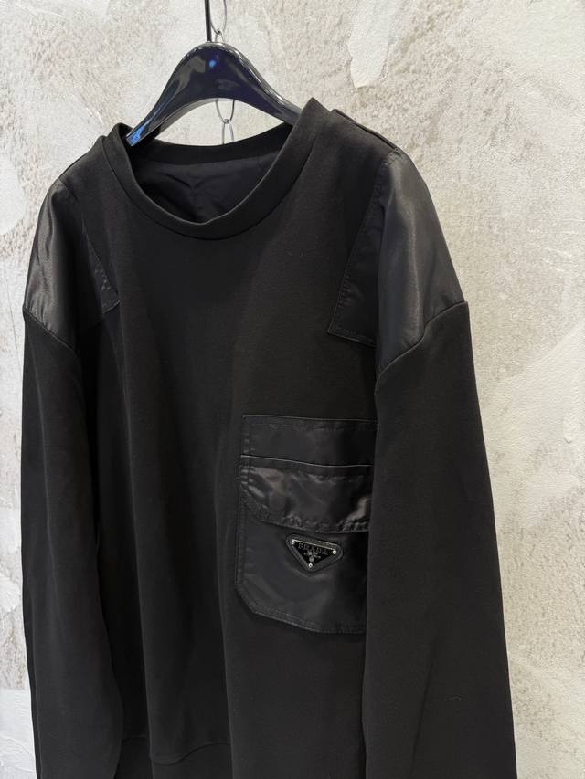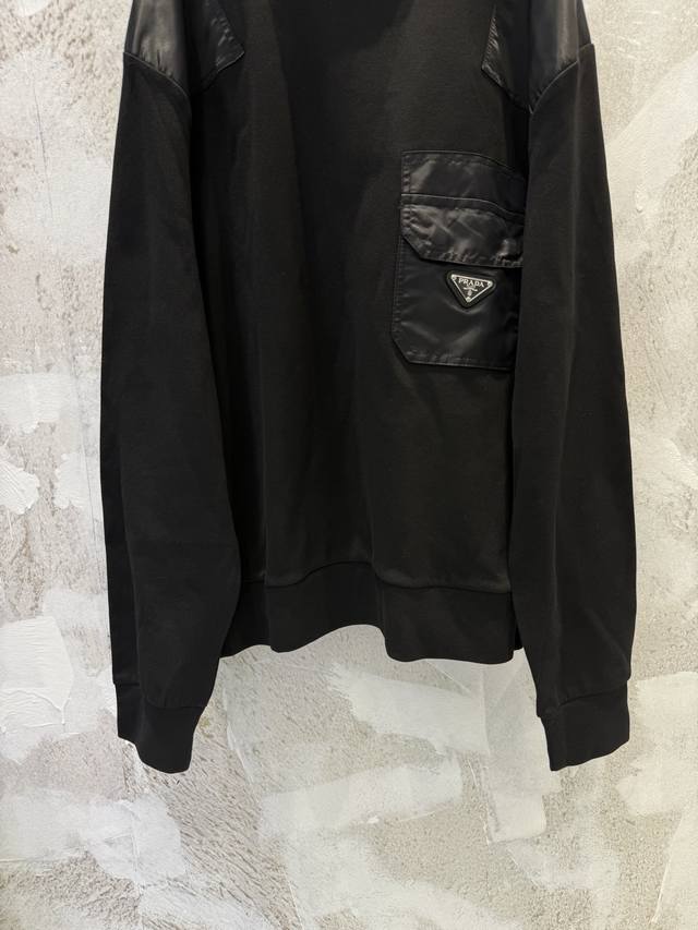 Prad New Pocket Triangle Logo Nylon Patchwork Sweatshirt DDD Prad Spring/Summer New Classic Sweatshirt The most basic style, a minimalist and understated fashion item Ddd Custom combed cotton high-density nylon fabric, molded and electroplated hardware triangle logo has always been a stable product Ddd The sweatshirt features patchwork nylon design on both sides of the shoulders, back elbows, and chest pockets, creating a modern mixed texture Ddd The Os fit is very slimming and flattering to the skin tone, super youthful, casual, simple, stylish, and full of personality Ddd Super cool unisex style Available Sizes: SML DDD