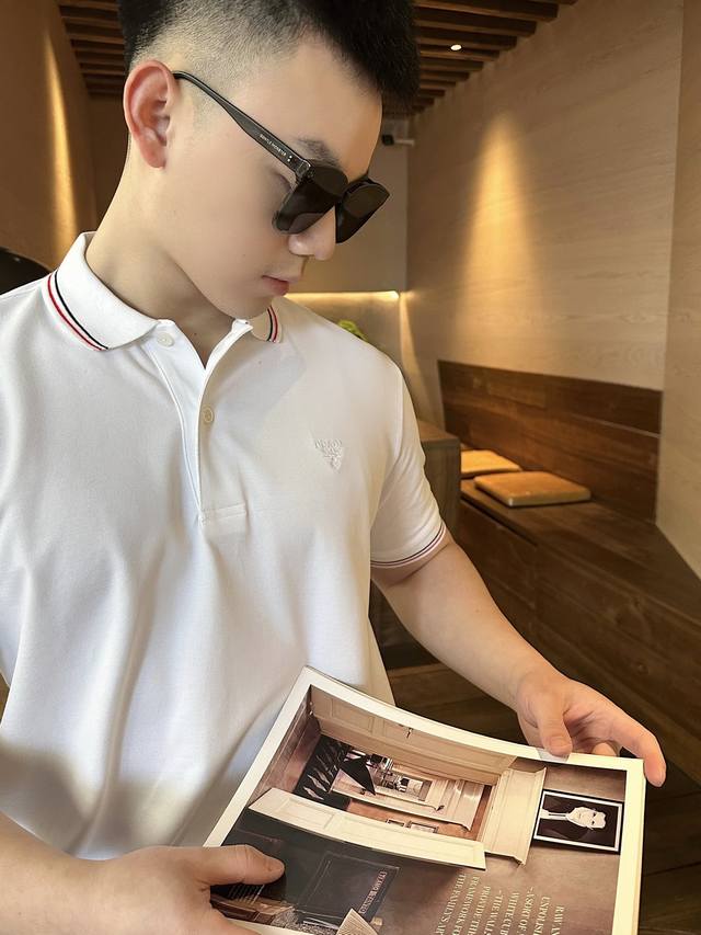 Prada Embroidered Logo Polo Shirt. Custom-made with a breathable, cool, and comfortable pearlescent knit. The white base with subtle black and red stripes adds a touch of vibrancy, making it simple yet eye-catching. The iconic Prada logo is prominently displayed on the chest, showcasing the brand's elegant charm and understated luxury. **Technique 1:** Imported machine embroidery technology uses an advanced computer control system and precise mechanical parts to achieve high precision in the Prada logo embroidery, resulting in smooth and delicate lines. **Technique 2:** Ribbed jacquard is a decorative weaving technique used in specific areas of the fabric. It utilizes different colored yarns to weave stripes in designated locations, significantly enhancing the fabric's beauty. **Technique 3:** The fabric is treated with a hand-washing process for a better feel and texture, making it less prone to deformation, shrinkage, and fading, maintaining its long-lasting beauty. **Accessories:** Custom 1:1 Prada logo; Custom 1:1 buttons. **Sizes:** M-XL