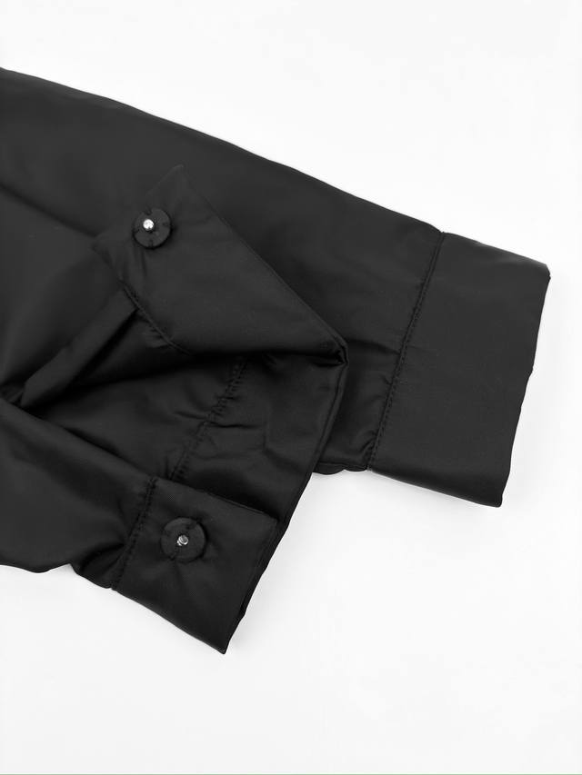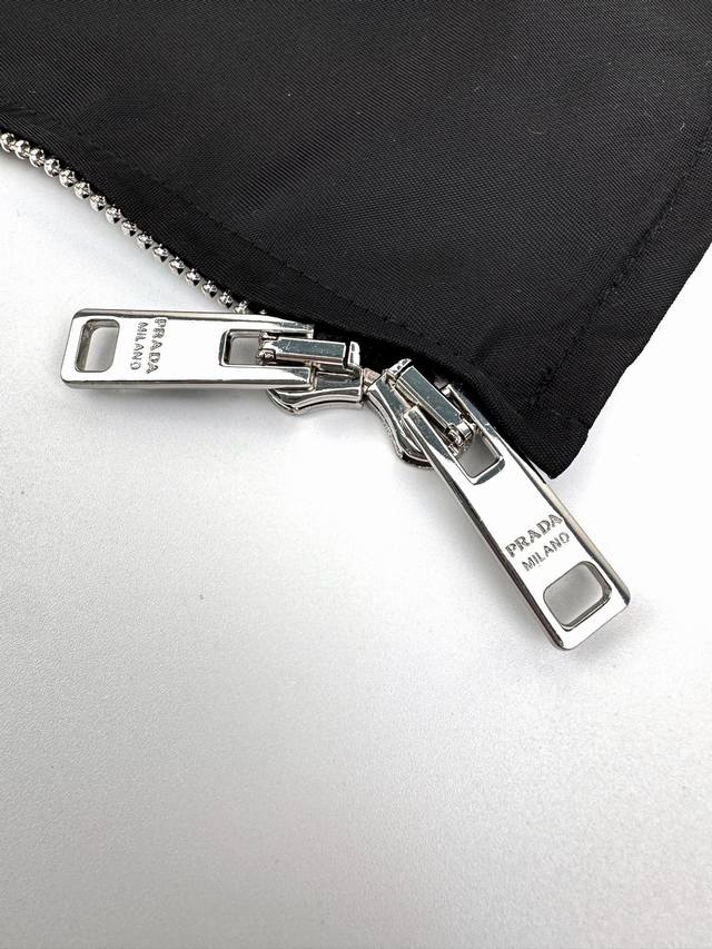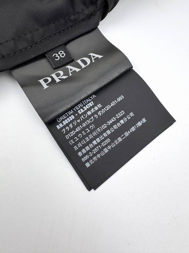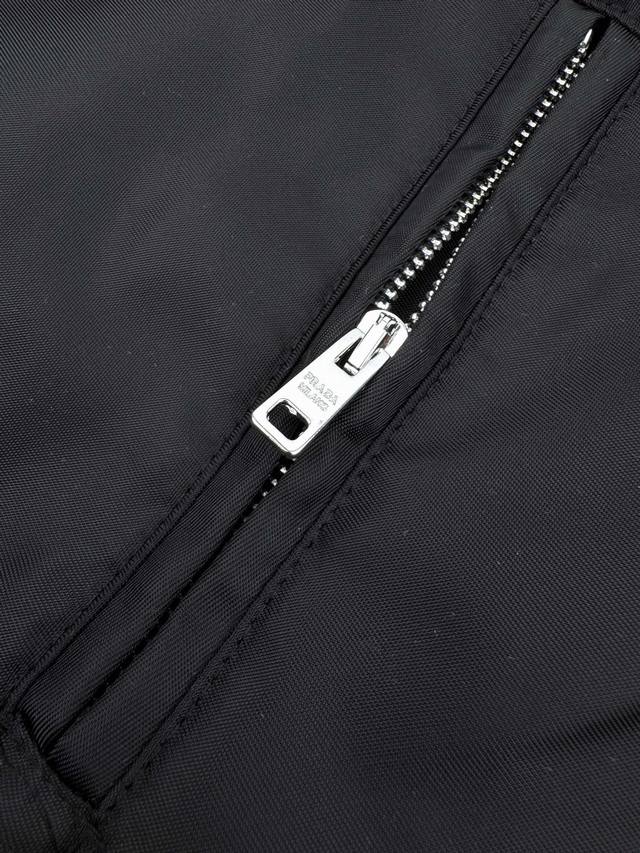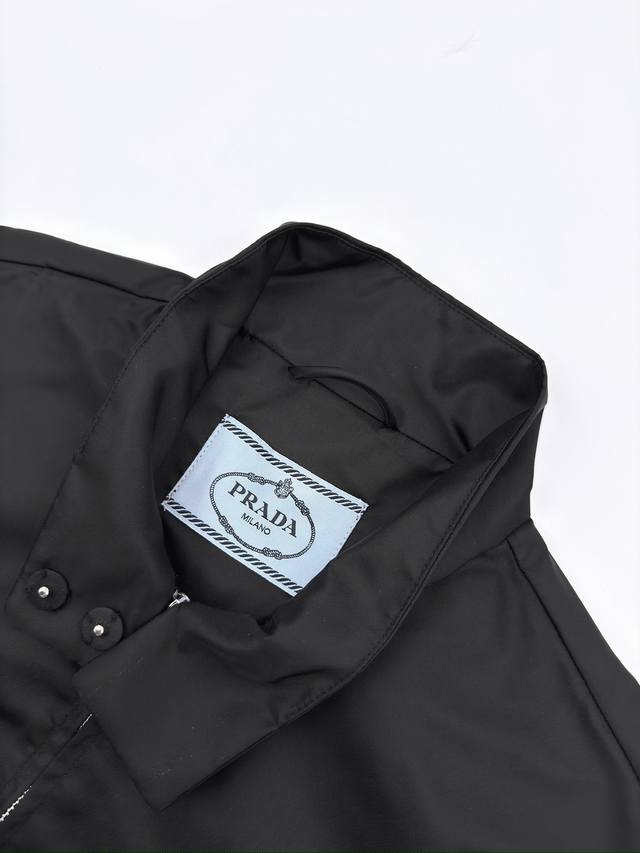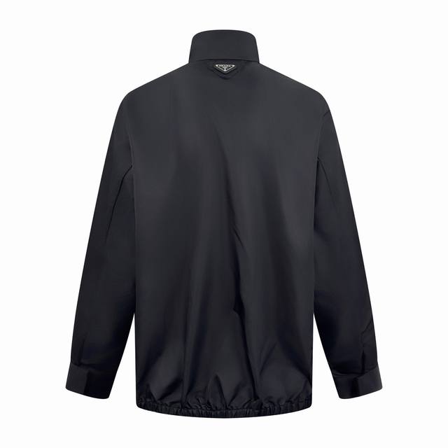 Prada Triangle Logo Jacket. Made of custom nylon twill protective fabric, this jacket boasts superior texture, comfort, and a classic black tone that exudes an innate sense of luxury. The front features a homogeneous design, while the iconic Prada triangle logo adorns the back, showcasing the brand's charm. Simple yet elegant, its understated luxury and unparalleled versatility make it a timeless classic in the fashion world. Craftsmanship 1: Custom pattern template machine sewing. Precise control of the sewing line through a pattern machine ensures accurate positioning of the Prada triangle logo. The delicate stitching between the label and the jacket edge creates a subtle transition. Craftsmanship 2: Template machine pocket opening. Pre-set templates guide the precise position, shape, and size of the pocket opening, ensuring high-quality results. Accessories: Custom 1:1 Prada triangle logo, custom 1:1 Prada zipper, custom 1:1 Prada bag buckle, custom 1:1 Prada trademark. Fit: Loose fit. Sizes: 36, 38. 40 42 DDD
