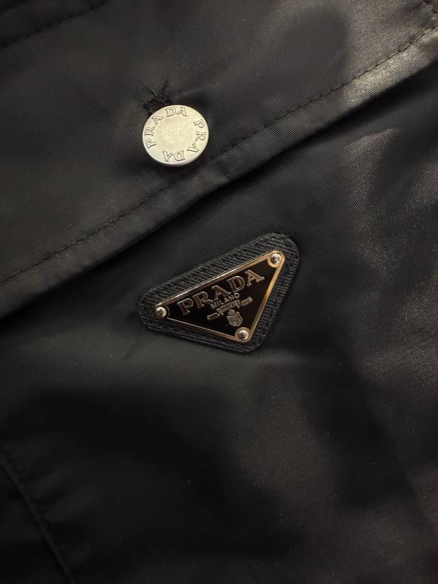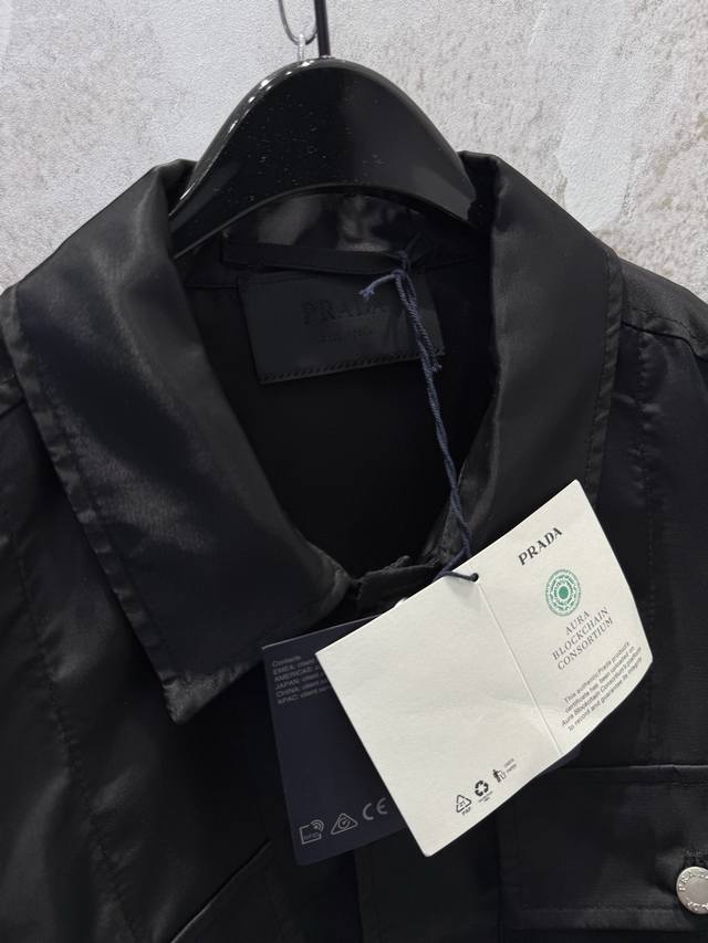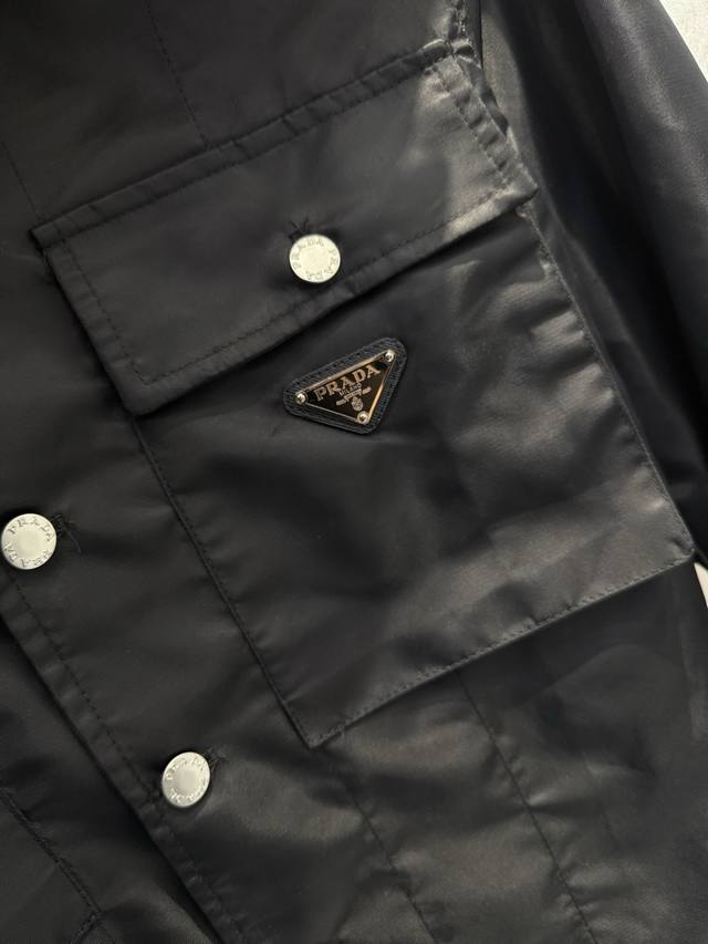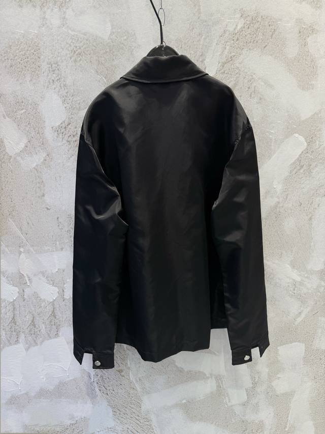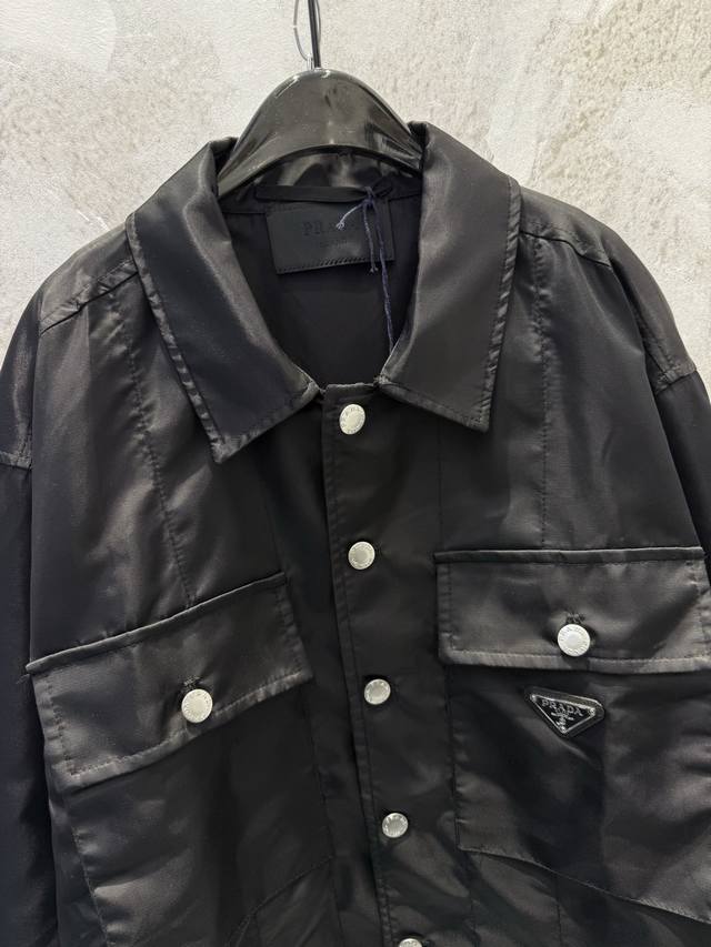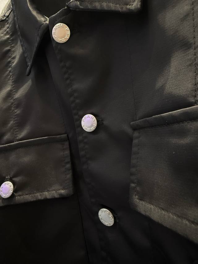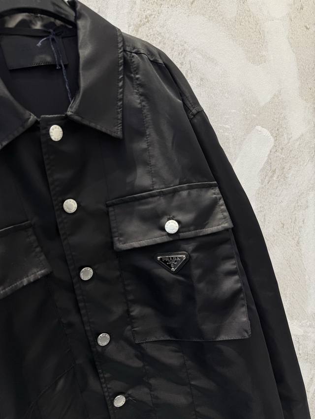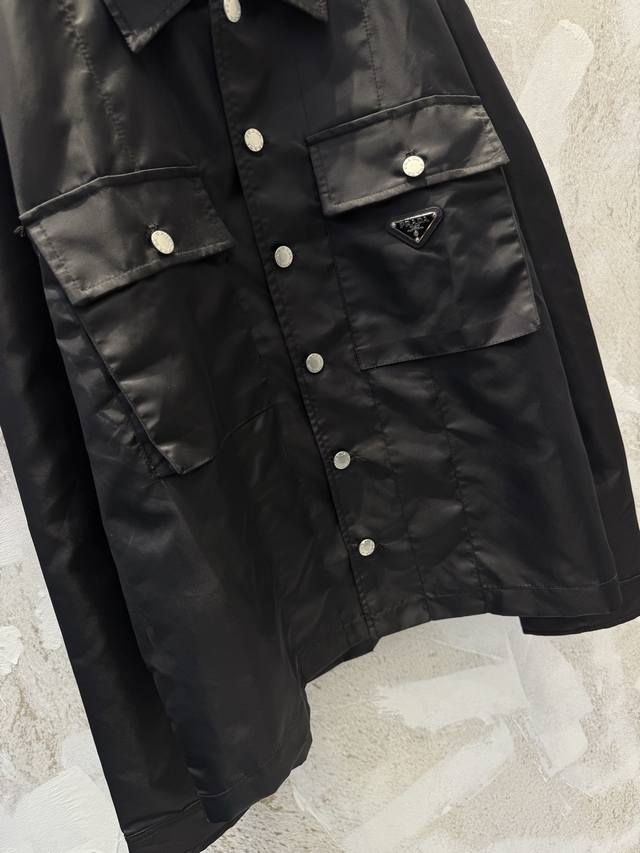 prad*New Nylon Pocket Triangle Label Workwear Shirt Ddd The triangle label is electroplated in black, and the black leather patch and nylon fabric have an incredibly delicate feel. Ddd The mysterious black color and the three-dimensional pocket on the chest give it a cool workwear vibe that will make you stand out on the street. Ddd The shirt collar and button closure accentuate the simple lines, and the unique cut design makes the overall silhouette super stylish. Ddd This is a very complex piece with perfect details. Wearing it will make you the coolest person on the street. Ddd Unisex style, suitable for all occasions! Size: SML DDD