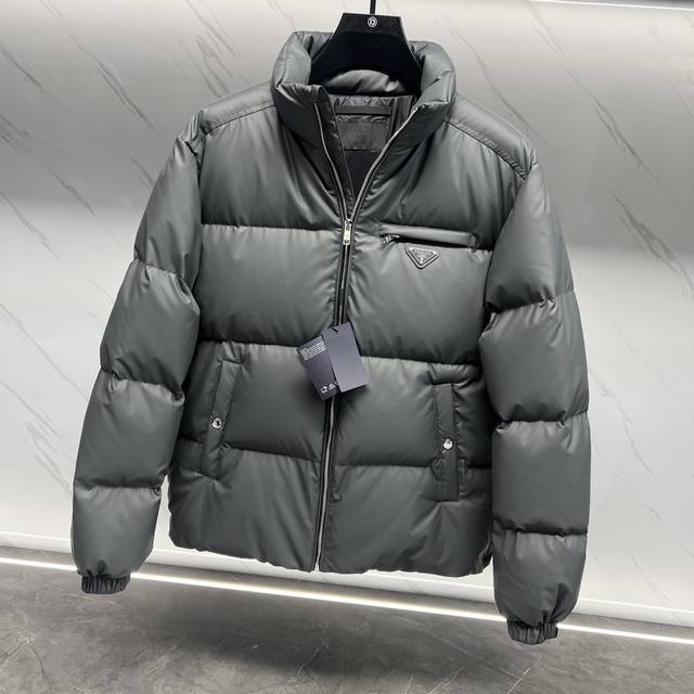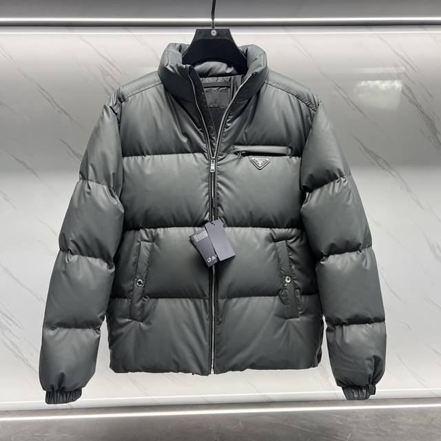 Premium Down Prada 23Fw Tech Leather Down Jacket. This jacket uses the latest 23Fw technological fabric, maintaining the soft and delicate texture of sheepskin. It is lighter and easier to care for than regular leather down jackets. The filling uses national standard 90% goose down, providing unparalleled warmth. The double-layered inner lining ensures excellent sealing and prevents down leakage. The hardware is all original factory matching; all drawstrings and adjustment buckles are custom-made. The metal triangle logo on the chest is the finishing touch. Only those who truly understand garment manufacturing can appreciate this level of craftsmanship. This is a must-have down jacket that combines quality and warmth. Sizes: 48-56. Black/High-grade Grey.