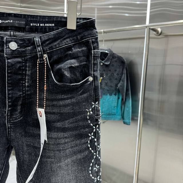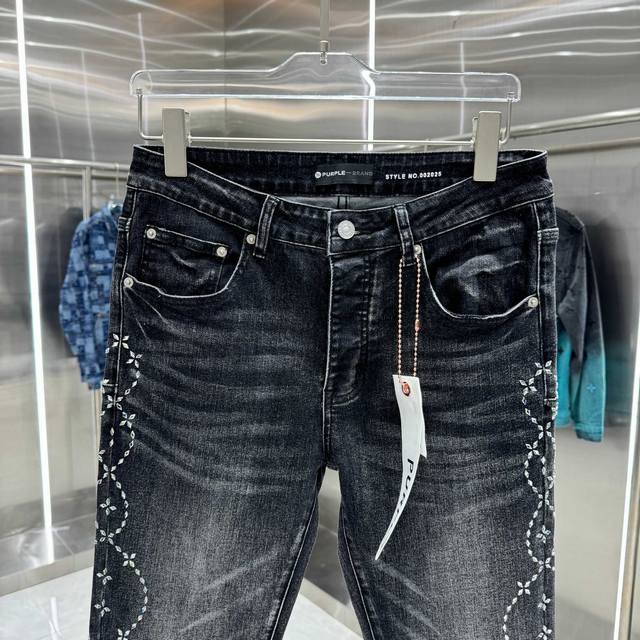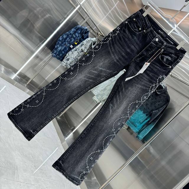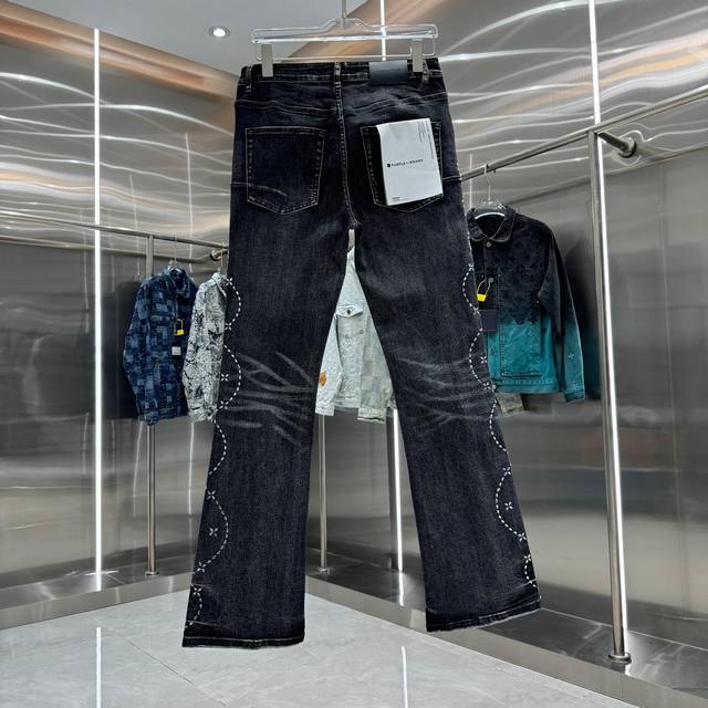 purple Brand Flared Stretch Jeans with Embroidered Lettering on Both Sides, Street Style, Color: Black, Sizes: 30, 32, 34, 36, 38 (DDD)