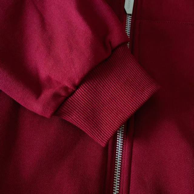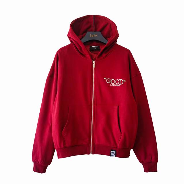 Real shot details + size chart. Goodbrand pearl slogan loose zip-up cardigan hoodie long-sleeved jacket. Unisex style, 500g heavyweight pure cotton fabric, original version, 1:1. Colors: Black, Burgundy. Kc031. Sizes: S, M, L, XL.