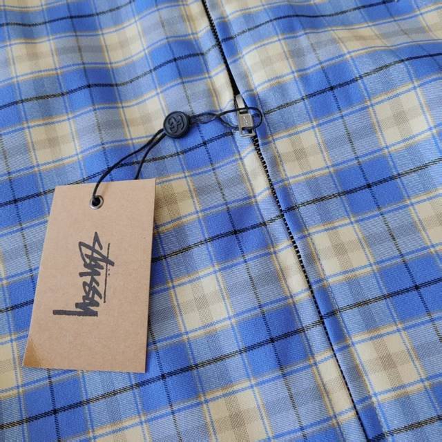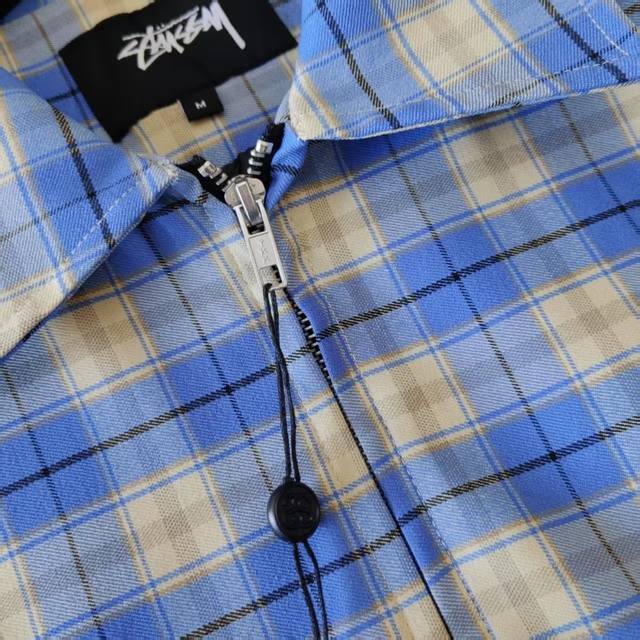 Real Shot Details + Size Chart Stussy Blue Plaid Jacket Stussy 2024 Spring New Arrival Recommendation Lapel Loose Coach Jacket Short and Wide Fit, Three-Dimensional and Stylish Placket with Metal YKK Zipper Lustrous Bronze Hardware Custom Four-Way Stretch Blue Plaid Fabric, Wrinkle-Resistant, Comfortable and Skin-Friendly Elastic Hem Custom Stussy Retro Label Three Tags Hang Tag Complete Washing Complete High-Quality Jacket Color: Blue Plaid 68 Size: ML XL
