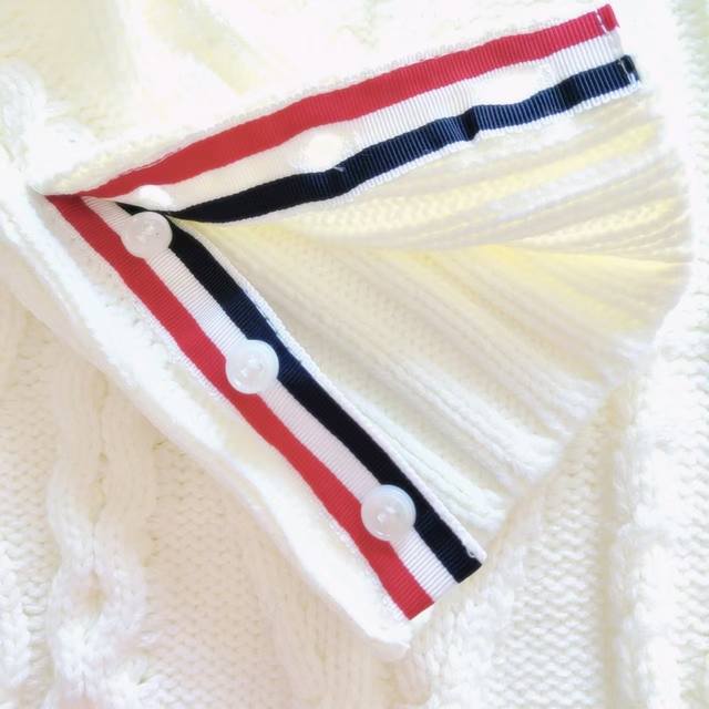 The fabric is made of soft and comfortable wool blend. Manufactured using imported Japanese automatic knitting machines with tight stitches. Sleeves are knitted with four stripes. Buttons are natural shell-shaped. Fit can be fitted or loose, comfortable and breathable, unisex style