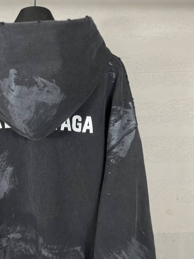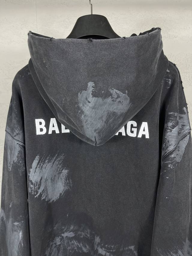 Real shot top version. Official website quality Balenci*Ga Paris #2025 new style hooded sweatshirt with front and back letter logo embroidery, hand-painted graffiti, washed, distressed, and vintage look. Full of design sense, welcome to compare. Note that the fabric uses genuine environmentally friendly dyes, custom-woven and dyed 100% cotton. Weight 460g, clean fabric surface, clear weave, soft and comfortable. Ribbing uses custom dyeing with no color difference. Classic letter logo is embroidered using imported Tajima embroidery machines. Finished garment washed, distressed, and vintage look, hand-painted graffiti. Extra heavy-duty process. Replicating a brick cabinet style, the fit uses an OS loose drop shoulder style. Unisex style. Code: Bl259908. Color: Black/Grey. Sizes: XS, SML, DDD.