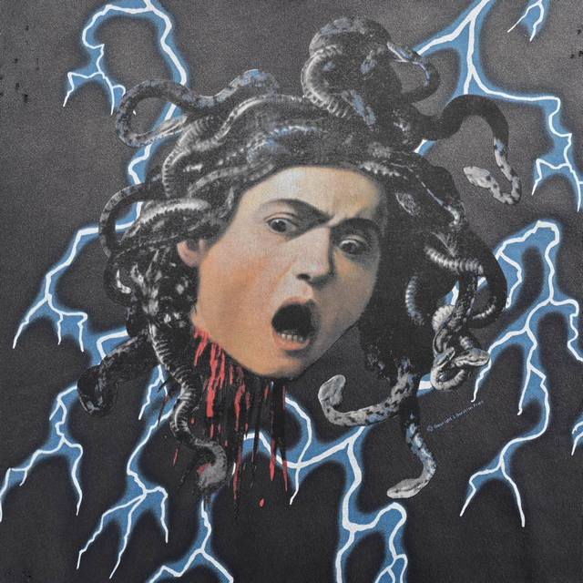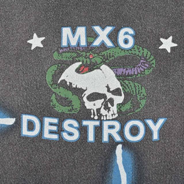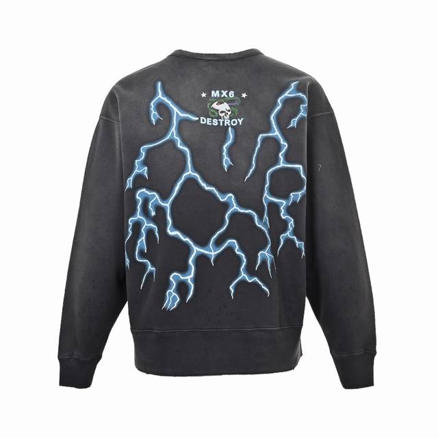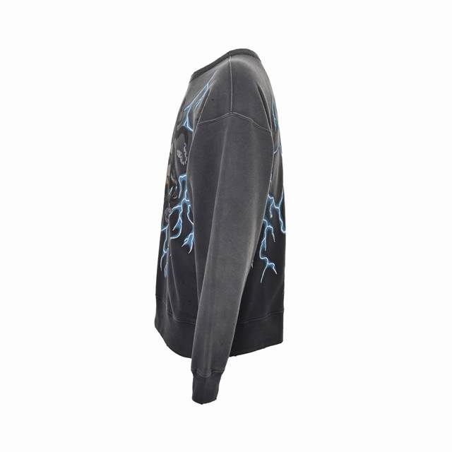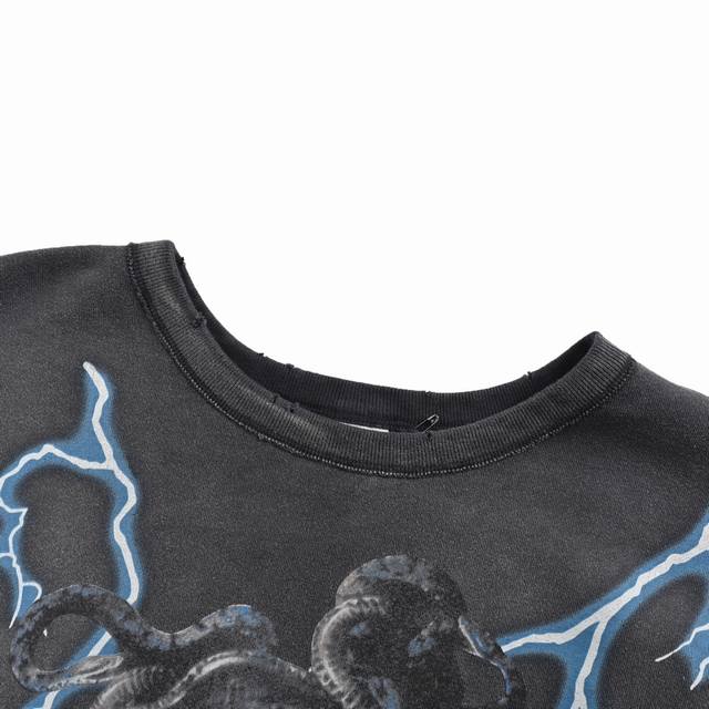 Saint Michael 24Fw Medusa Hydra Print Crew Neck Sweatshirt. Made of 380g pure cotton with a 32-thread count and 8-thread count combed cotton lining. American-style loose-fitting drop-shoulder design. The garment undergoes a garment washing and enzyme wash followed by sand washing and dyeing. After a series of distressing treatments, it achieves a unique faded and whitish effect. The fabric surface has a rough, distressed feel, and the overall look is very beautiful. After drying, the overall distressed and whitish effect is achieved through random variations. Vintage style, reflecting the changes in the fabric over time. Michael directly uses a series of processes to create an aged look using new fabric, resulting in an effect that reflects the passage of time. The final result is undoubtedly excellent. The difficulty in printing lies in achieving the vintage feel and the subtle variations in color depth. This requires constant communication and revisions with the printing factory to achieve a satisfactory final effect. The printing process uses a special tearing paste. The printing itself is heated at high temperatures, and after cooling, it naturally cracks. After printing, it is washed to create a secondary aged effect, achieving a partially damaged print. The package includes the main label, neck label, wash label, hang tag, and all accessories. Size: S-XL.