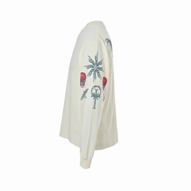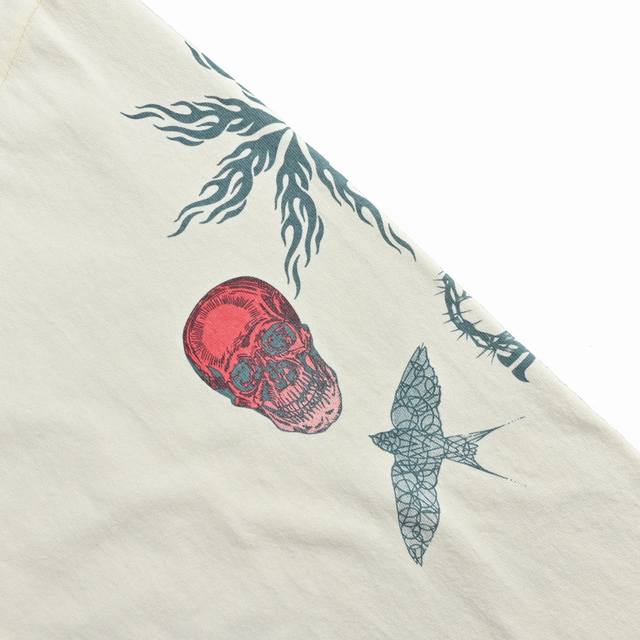 Saint Michael 25Fw Tattoo Print Long-Sleeve Shirt DDD The overall fabric is 260g 100% pure cotton 16-thread double-yarn jersey. The ribbing is 300g 100% pure cotton 1*1 stretch unraveled ribbing. After garment washing, the weight increases to about 280g. The overall appearance is slightly distressed, but the overall color is not black. Both the front and back prints are digitally printed using imported high-nozzle direct-to-garment printers. The overall color is rich and the color separation is accurate, presenting the print effect. However, the print is not a solid print. Through the print, you can see that the fabric color is covered with a white transparent protective paste to prevent the print from peeling off. The small text next to the print is clear and not blurry. The cuffs and hem are stitched using retro single-line overlocking technology. Custom hangtags and all accessories are complete. The outer packaging stickers and codes are all in place. DDD Size: S-XL DDD
