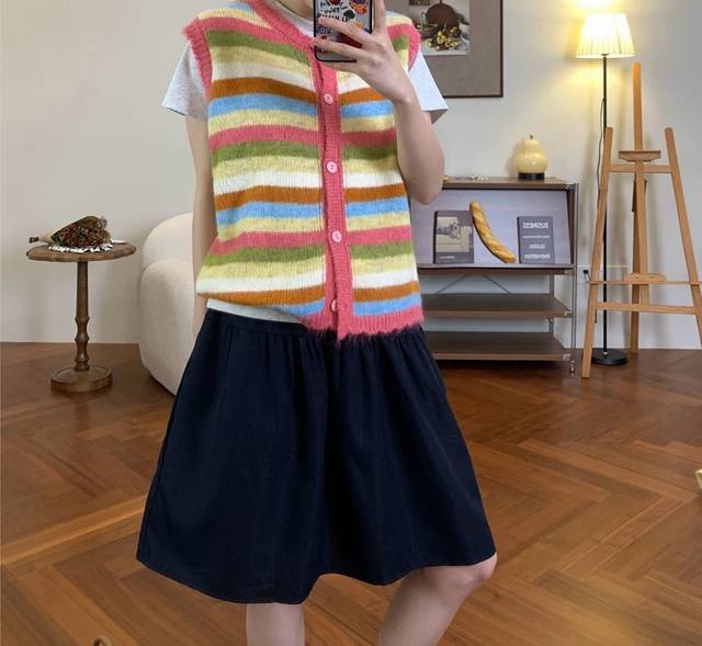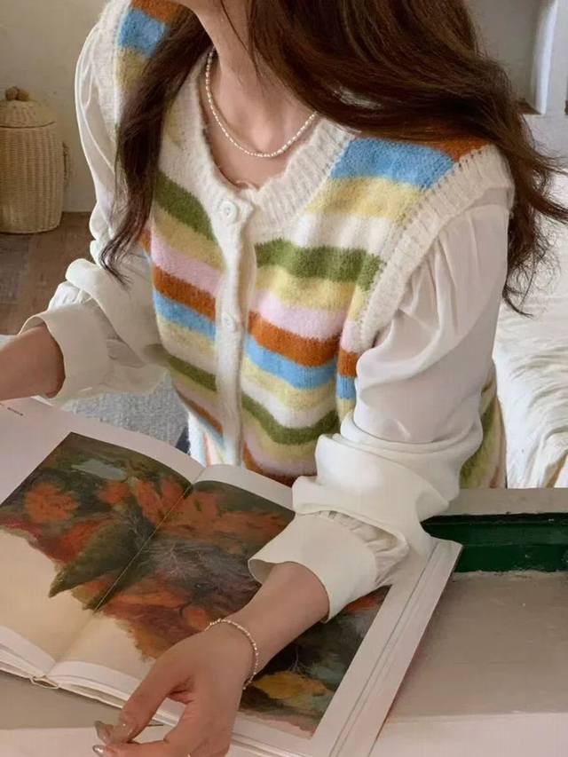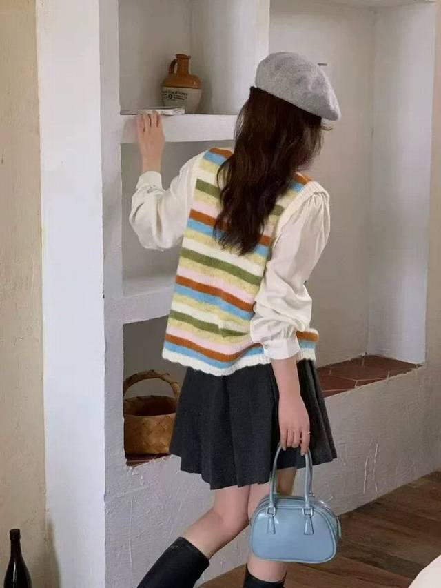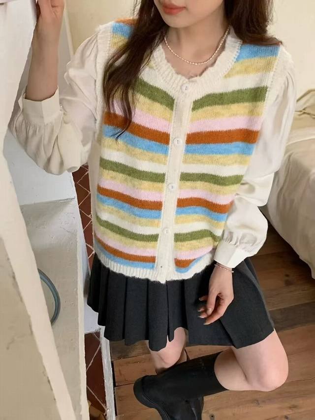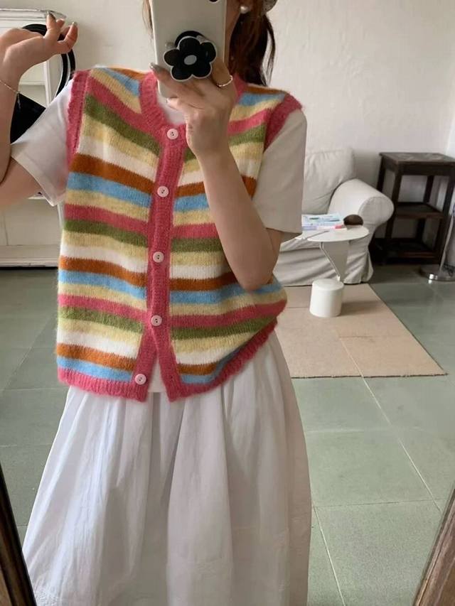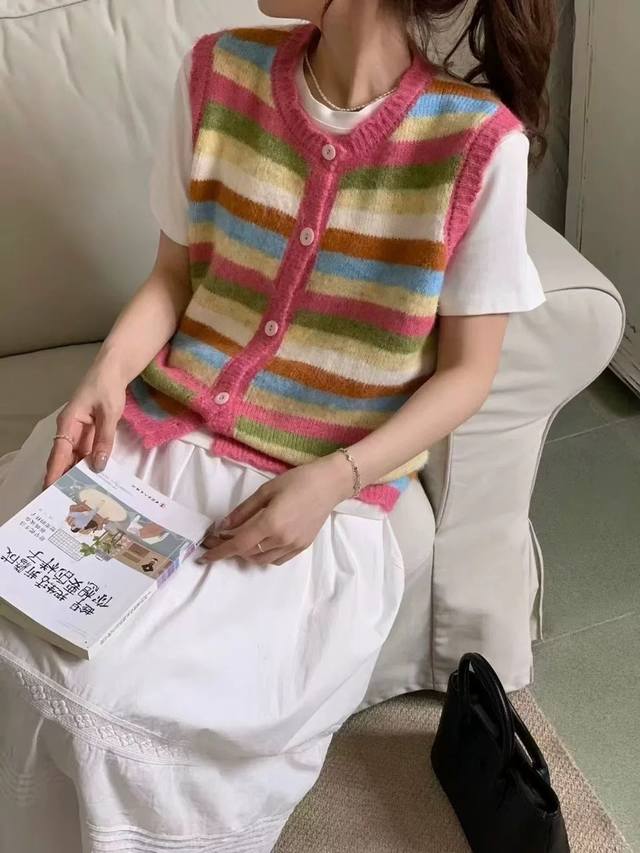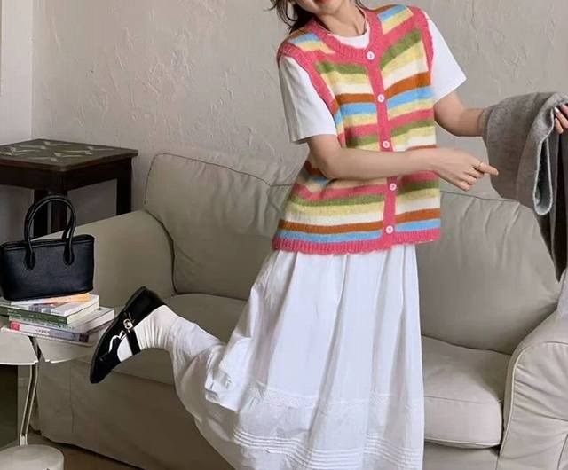 Sandro Colorful Striped Knit Vest, Dopamine Rainbow Striped Knit Vest for Women. A Korean-style, versatile, soft, sleeveless cardigan sweater with a versatile, fall/winter vibe. A must-have for fall/winter! A macaron-striped knit vest unlocks endless layering possibilities.