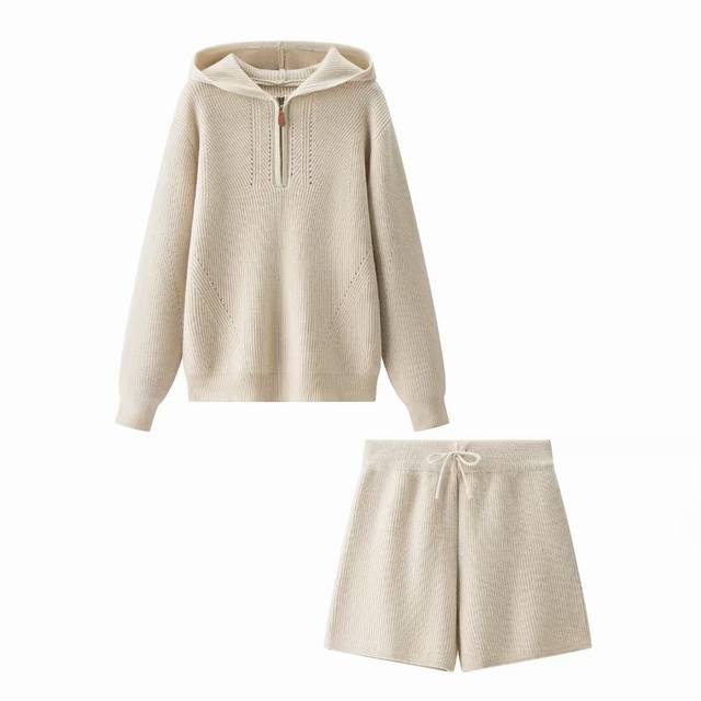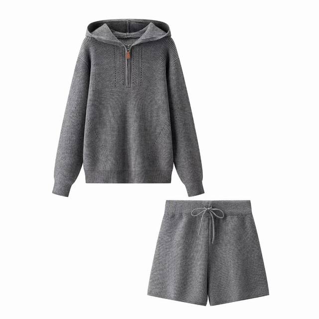 Sandro half-zip sweater and shorts set, a new, relaxed winter knit suit for women. This simple, loose-fitting half-zip hooded top and shorts two-piece set is perfect for a laid-back autumn look. A hooded sweatshirt and shorts set creates a relaxed, sophisticated vibe. Who hasn't embraced the joy of a knit suit? This two-piece hooded sweatshirt and shorts set embodies that laid-back, relaxed vibe! Both colorways are captivating: The beige and apricot set is subtly gentle, evoking the autumn sun and creating a soothing effect, perfect for everyday wear or at home. The dark gray set is understated yet sophisticated, offering a cool yet casual feel for effortlessly chic looks. The sweatshirt features a half-zip hood, creating a relaxed look that flatters the neckline. The fine knit fabric is soft and comfortable, providing warmth without bulk in autumn or winter. The matching shorts are a high-waisted drawstring design with a loose fit that hides fat and makes you look thinner, while also subtly lengthening your legs.