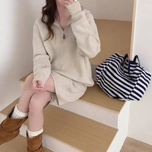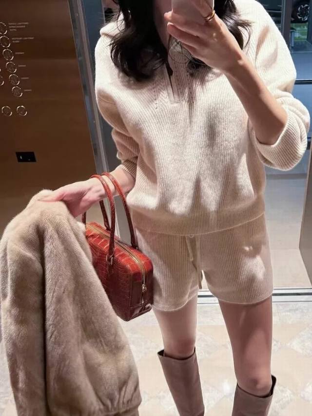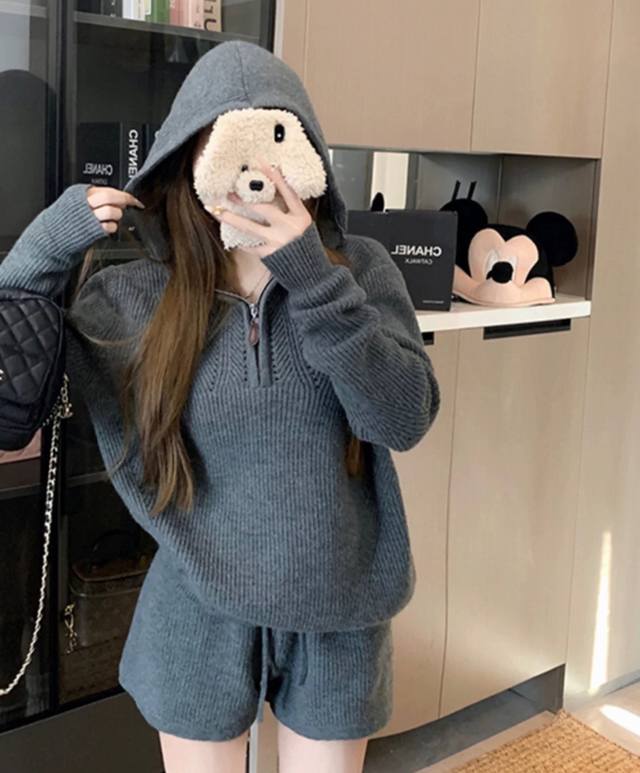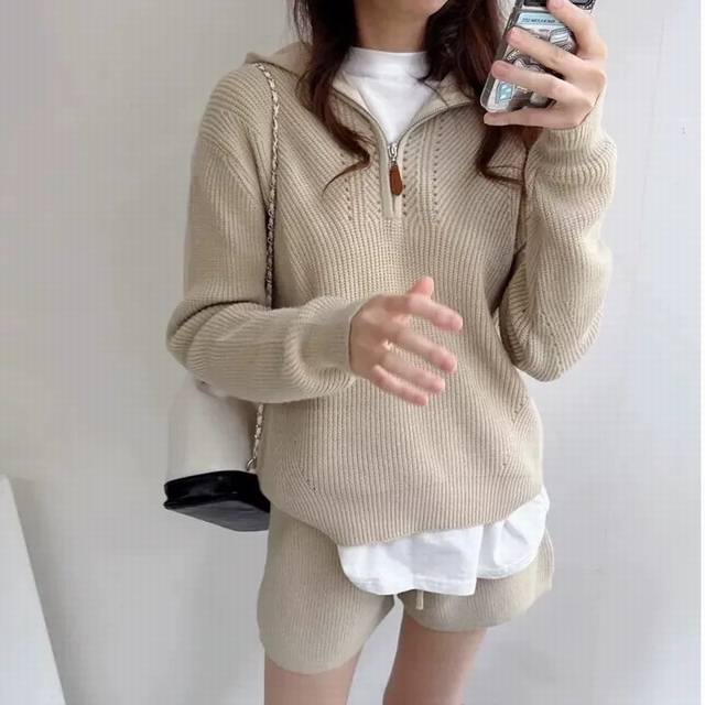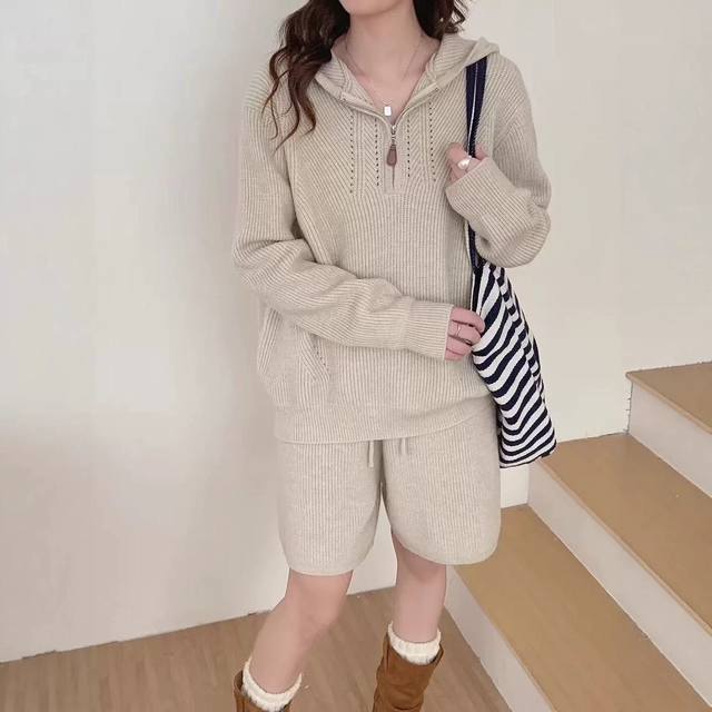 Sandro half-zip sweater and shorts set, a new, relaxed winter knit suit for women. This simple, loose-fitting half-zip hooded top and shorts two-piece set is perfect for a laid-back autumn look. A hooded sweatshirt and shorts set creates a relaxed, sophisticated vibe. Who hasn't embraced the joy of a knit suit? This two-piece hooded sweatshirt and shorts set embodies that laid-back, relaxed vibe! Both colorways are captivating: The beige and apricot set is subtly gentle, evoking the autumn sun and creating a soothing effect, perfect for everyday wear or at home. The dark gray set is understated yet sophisticated, offering a cool yet casual feel for effortlessly chic looks. The sweatshirt features a half-zip hood, creating a relaxed look that flatters the neckline. The fine knit fabric is soft and comfortable, providing warmth without bulking up in autumn and winter. The matching shorts are a high-waisted drawstring design with a loose fit that hides fat and makes you look thinner, while also subtly lengthening your legs.