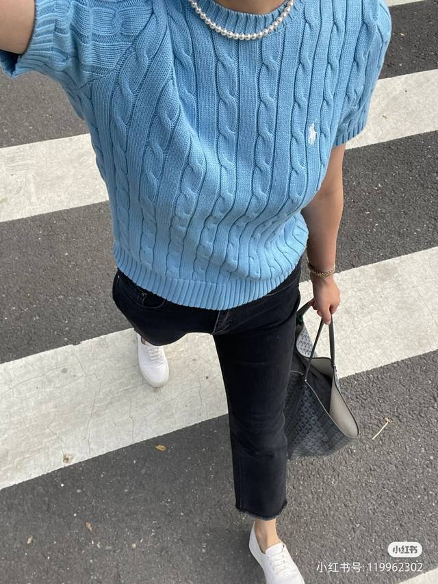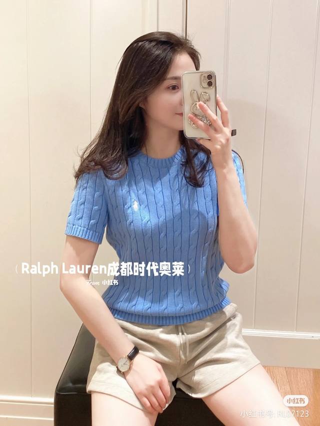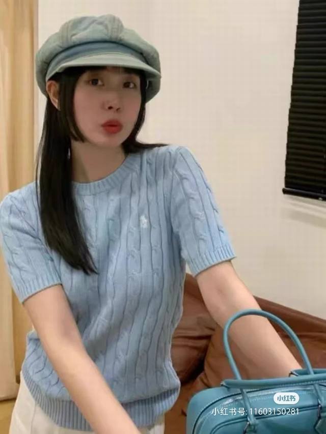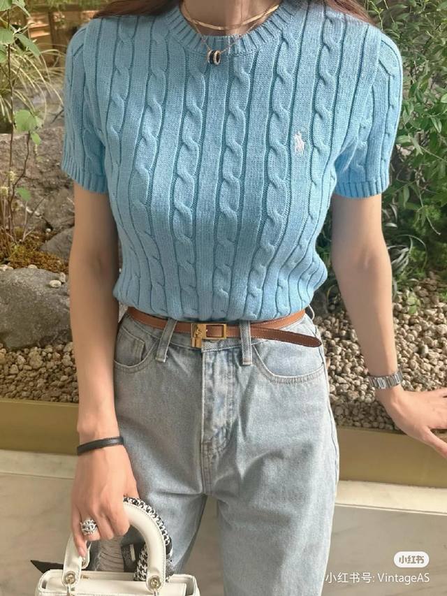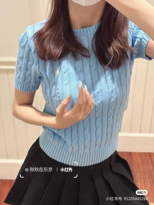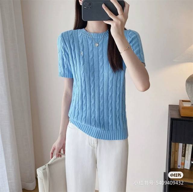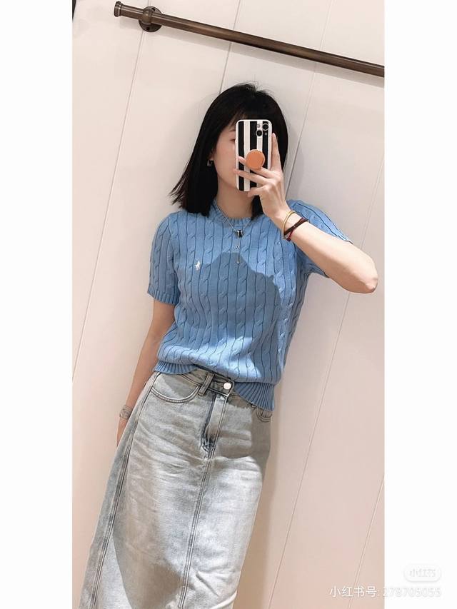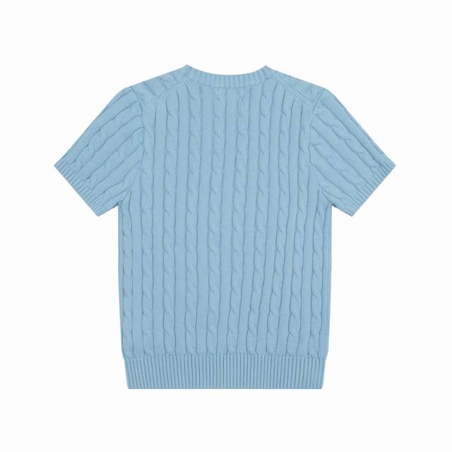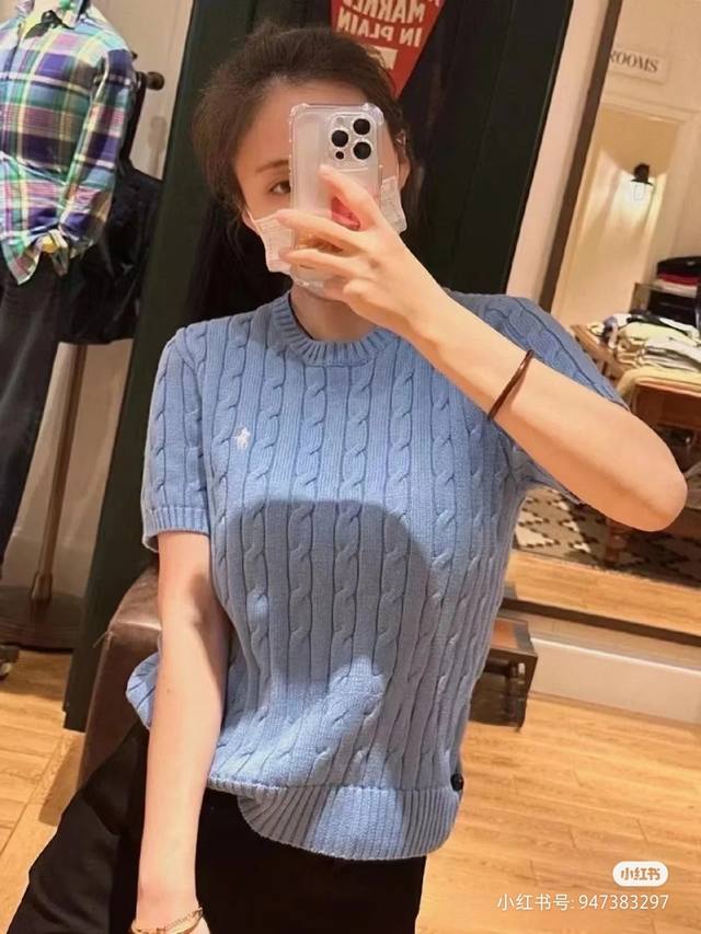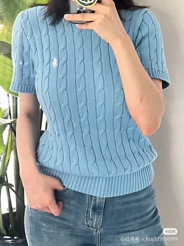 Special offer only size S Ralph Lauren round neck solid color pony embroidered logo knit short sleeve top. Soft and comfortable against the skin, the all-over cable knit design is complex and time-consuming to produce. The round neck design flatters the neck and face, adding a touch of sophistication to everyday wear. The overall look is relaxed and casual, suitable for all occasions and body types, and very fashionable.