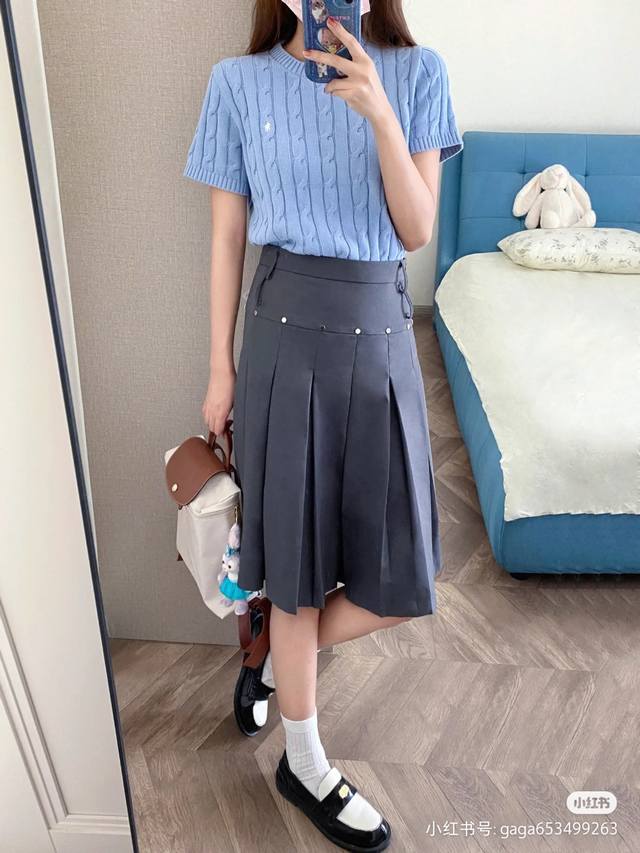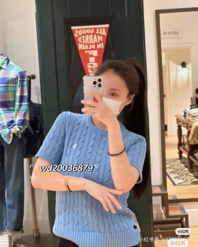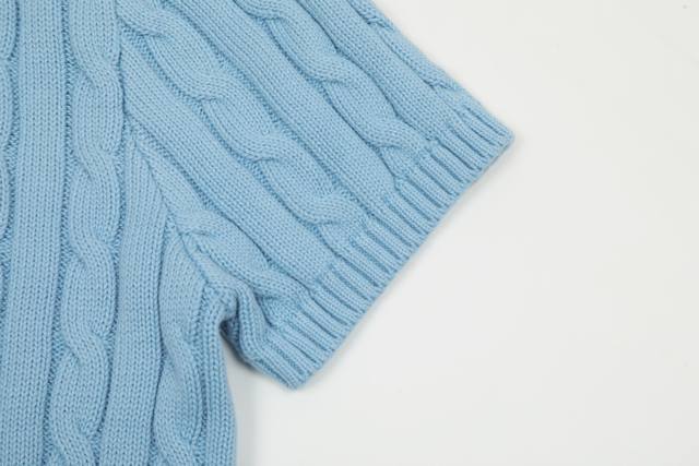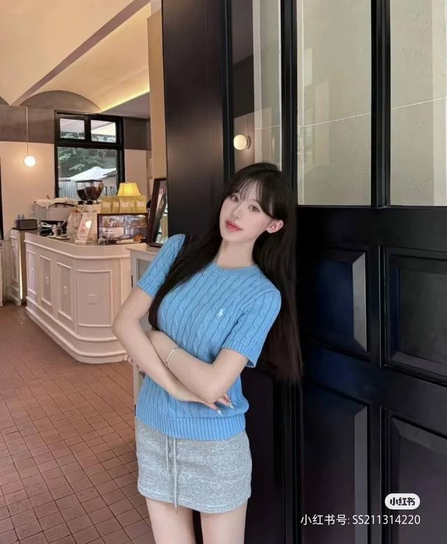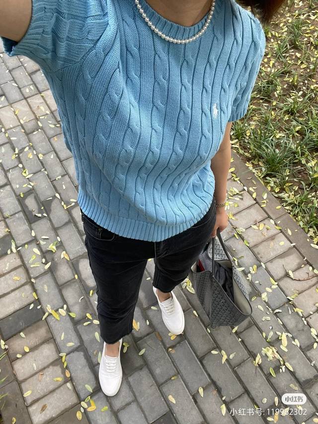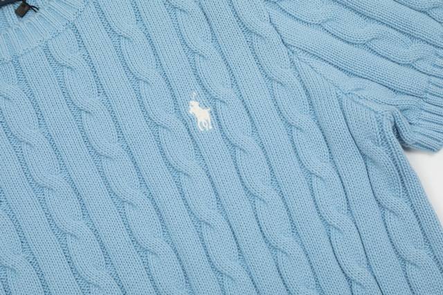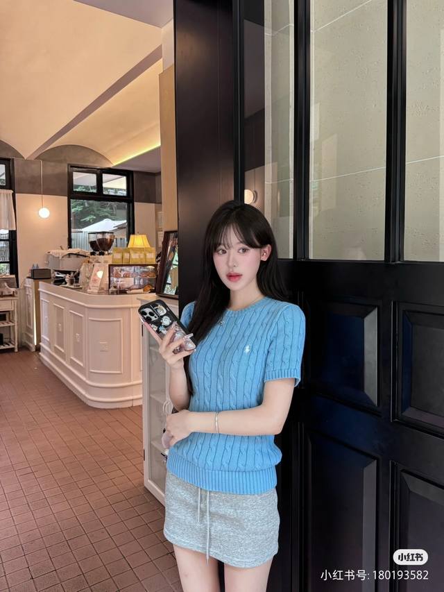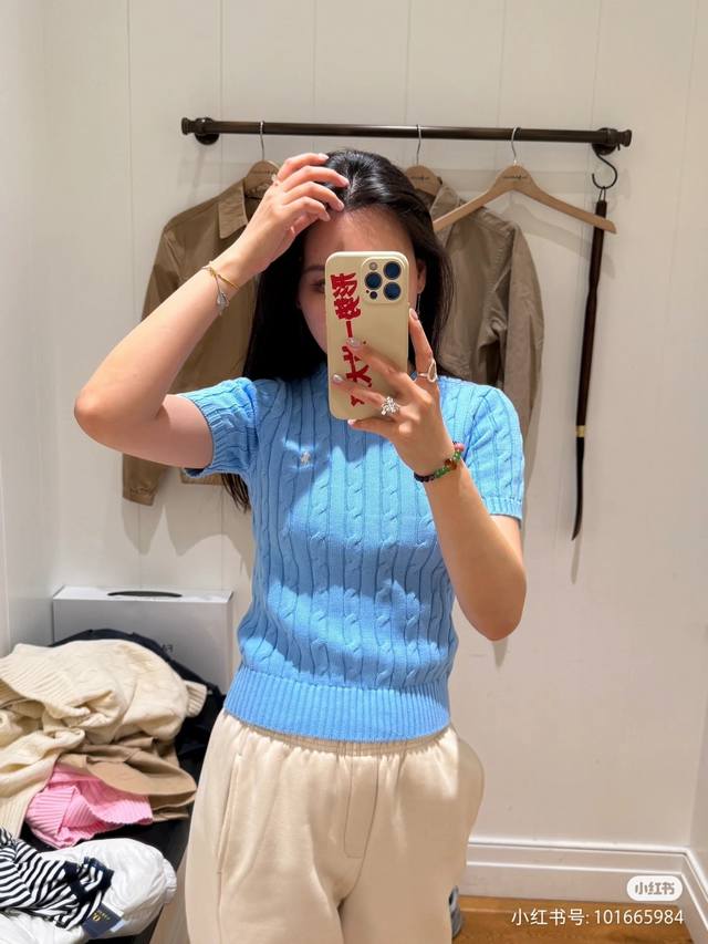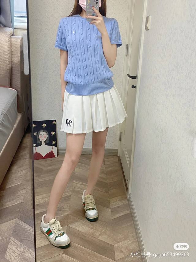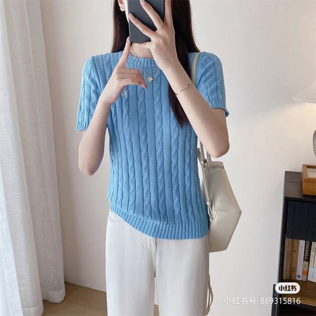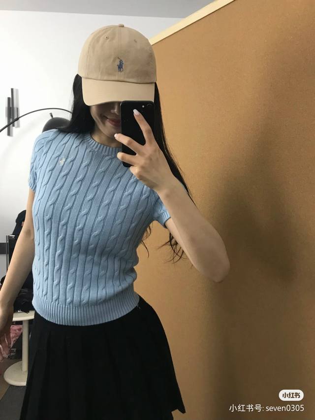 Special offer only size S Ralph Lauren round neck solid color pony embroidered logo knit short sleeve top. Soft and comfortable against the skin, the all-over cable knit design is complex and time-consuming to produce. The round neck design flatters the neck and face, adding a touch of sophistication to everyday wear. The overall look is relaxed and casual, suitable for all occasions and body types, and very fashionable.