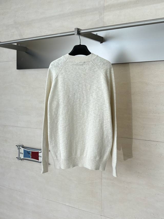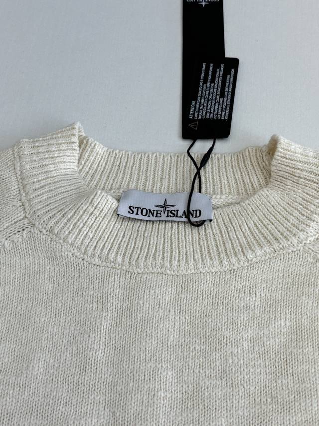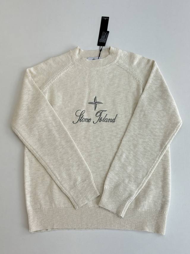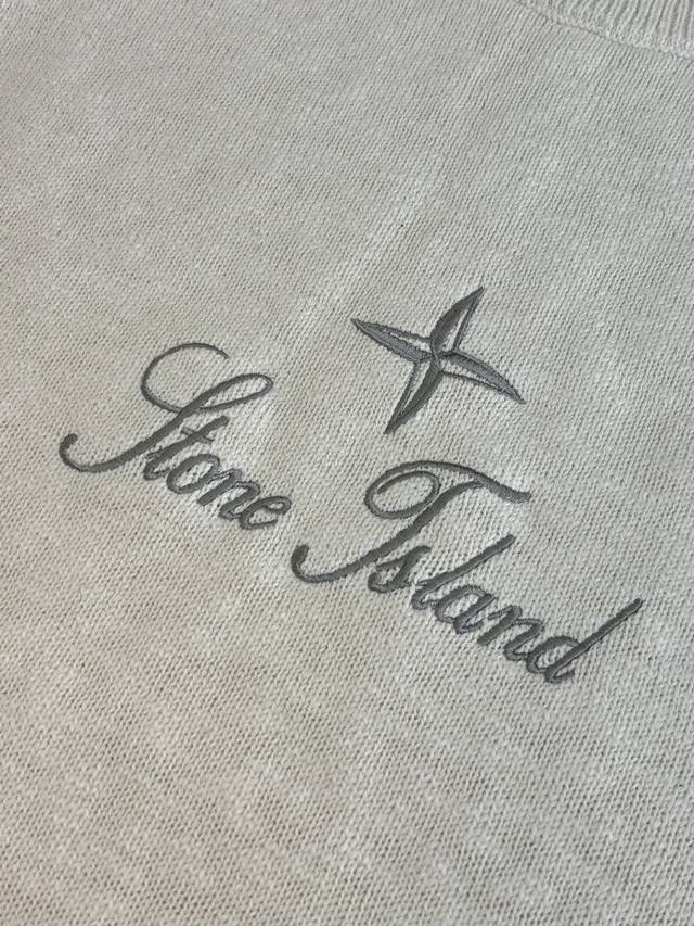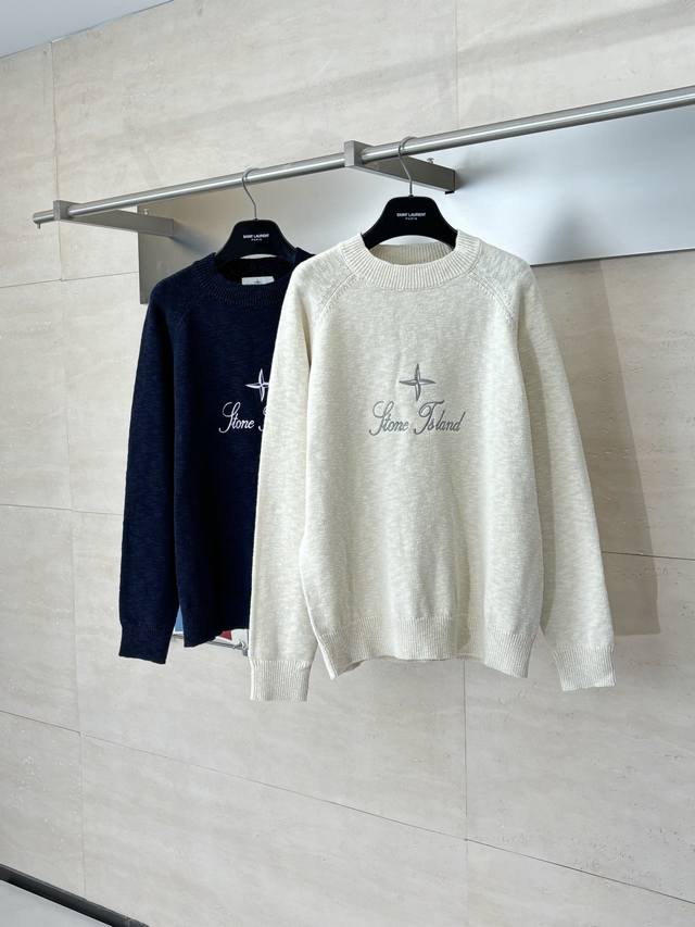 Stone Islan* Stone Islan Fw25 Holiday Limited Edition Ribbed Edge Logo Embroidered Pullover Knit Sweater DDD. The fabric is made from imported superfine Merino wool yarn, combed to remove impurities and treated to prevent pilling. It's woven on a 14-needle circular knitting machine with a plain weave base. The yarn is pre-dyed before weaving, resulting in a rich navy blue hue that resists fading. The sweater features raglan sleeves, with laser-cut shoulder panels and seamless seams achieved using a welt technique for a comfortable, unrestricted fit. The brand logo and star pattern on the chest are created using a combination of hand-appliqu