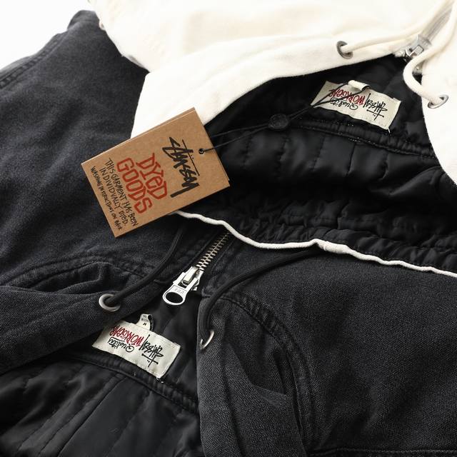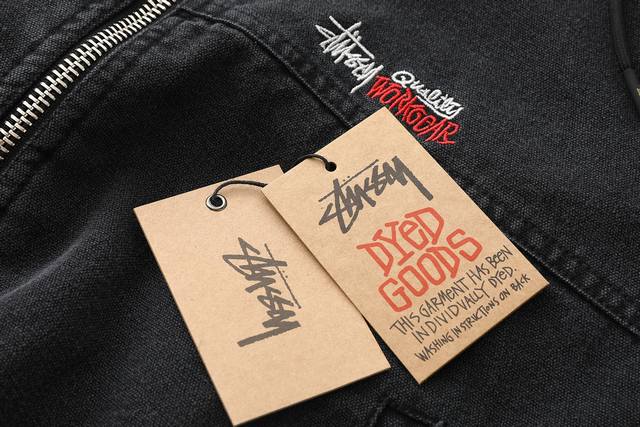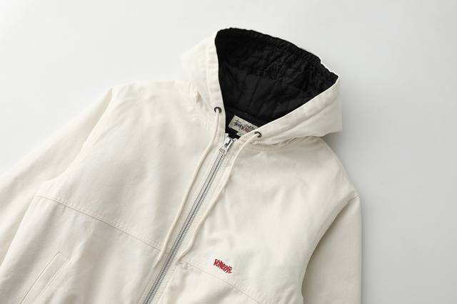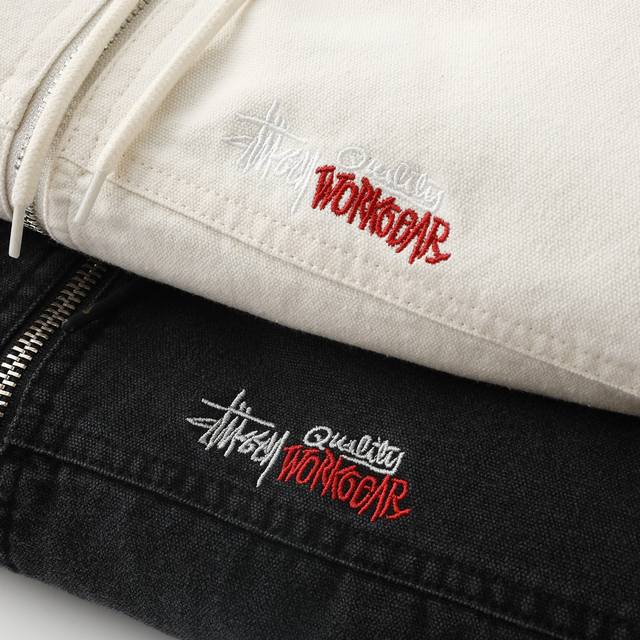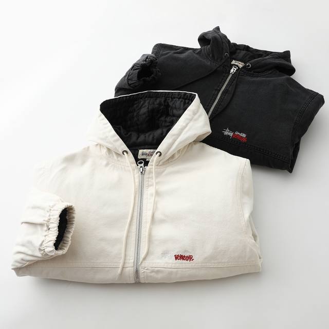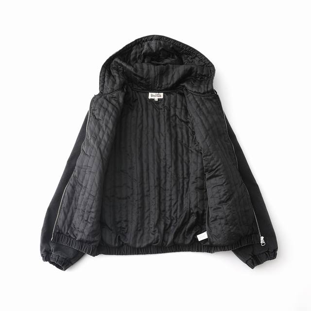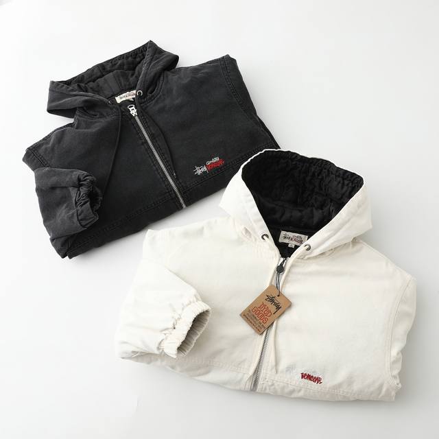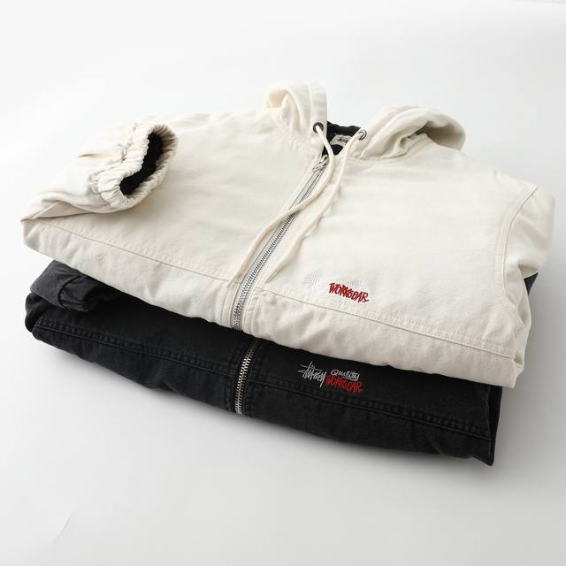 Stussy 24Fw washed and distressed logo embroidered zippered padded jacket. Unisex style , perfect for American retro streetwear. Vertically quilted satin lining, 100% cotton. Ykk metal zippered slanted welt pockets. Stussy font embroidered on the left chest. Originally developed, one-to-one pattern making, all trims matched! Elastic cuffs and hem, cropped and loose fit, stylish for any outfit! Color: Black, Off-White. Size: M-L, Xl-Xxl.