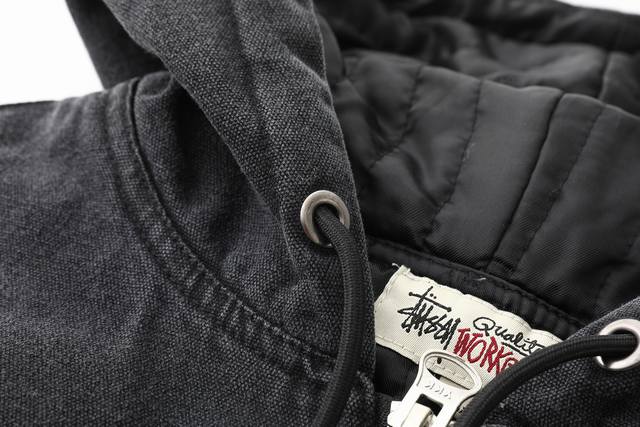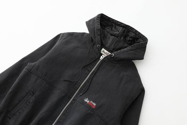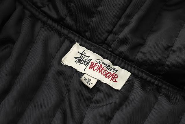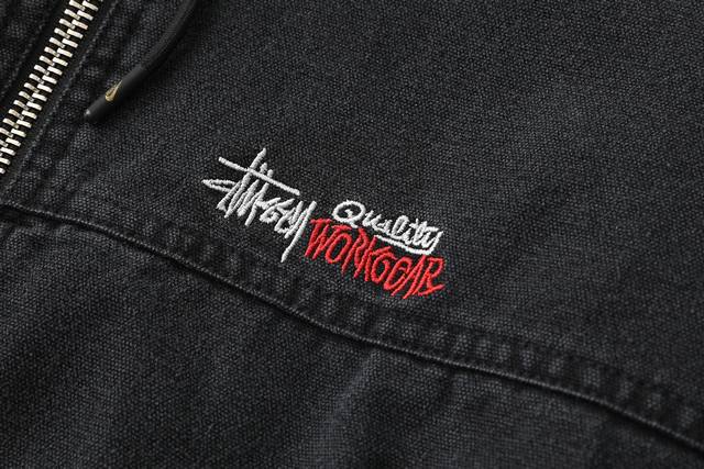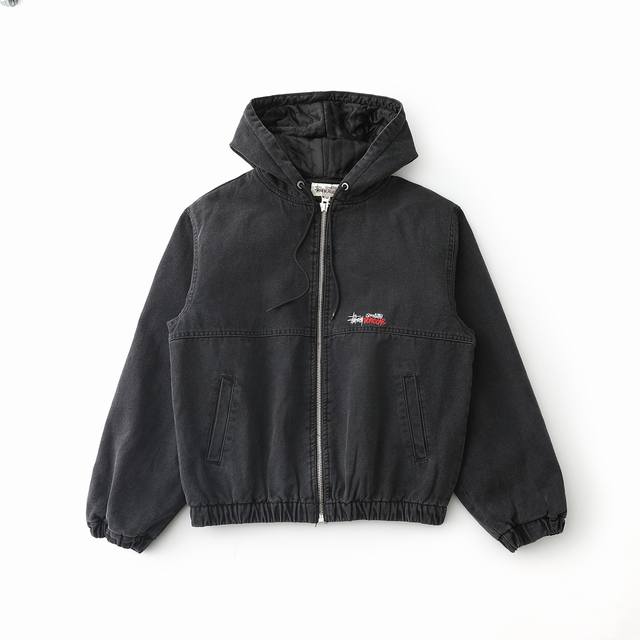 Stussy 24Fw washed and distressed logo embroidered zippered padded jacket. Unise