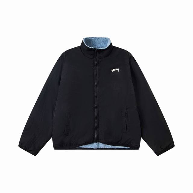 Style No. 307# In Stock Stussy Fw24 Sherpa Reversible Jacket, Reversible with Patch Pockets, Zippered Stand Collar, American Retro Style, Unisex. Colors: Blue, Apricot. Sizes: S, M, L, XL.