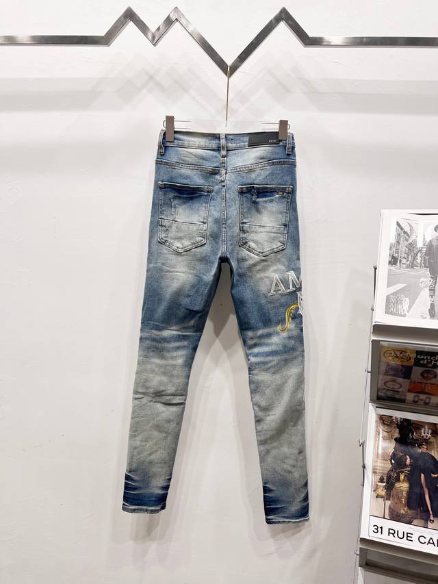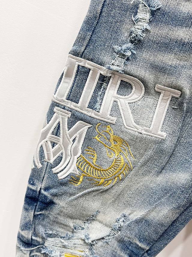 Amiri & Amiri 2025 new style heavily embroidered yellow patched washed stretch jeans for couples. Top-quality