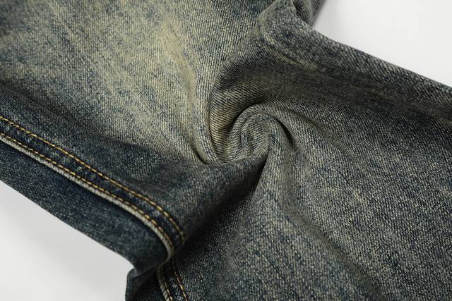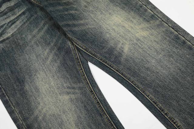 Custom-made hardware, leather patches, buttons, and zippers. The jeans use a washed distressing process, and the fabric color requires repeated washing to achieve a close resemblance to the original.