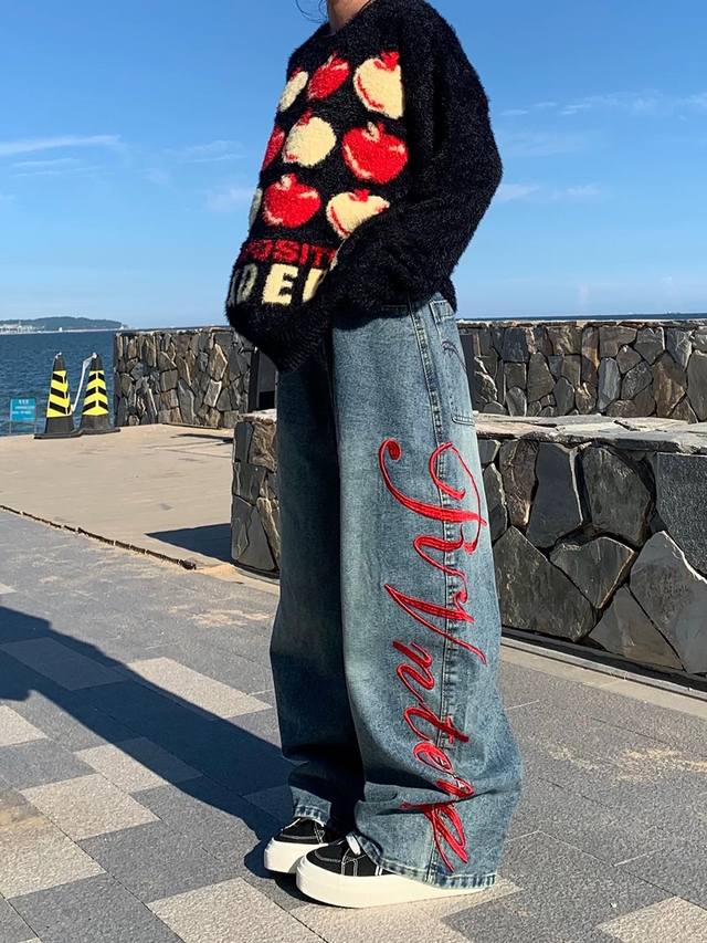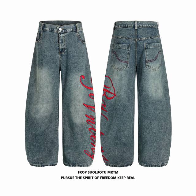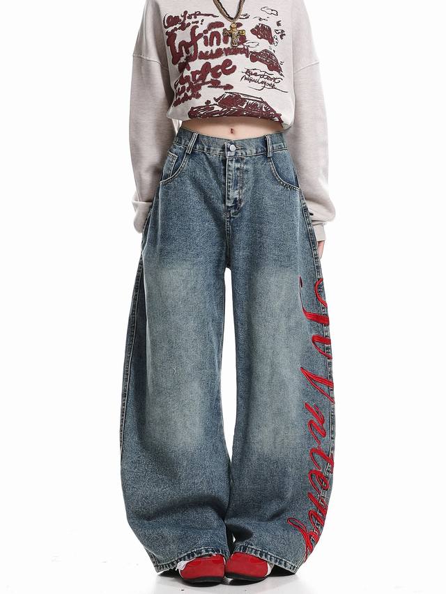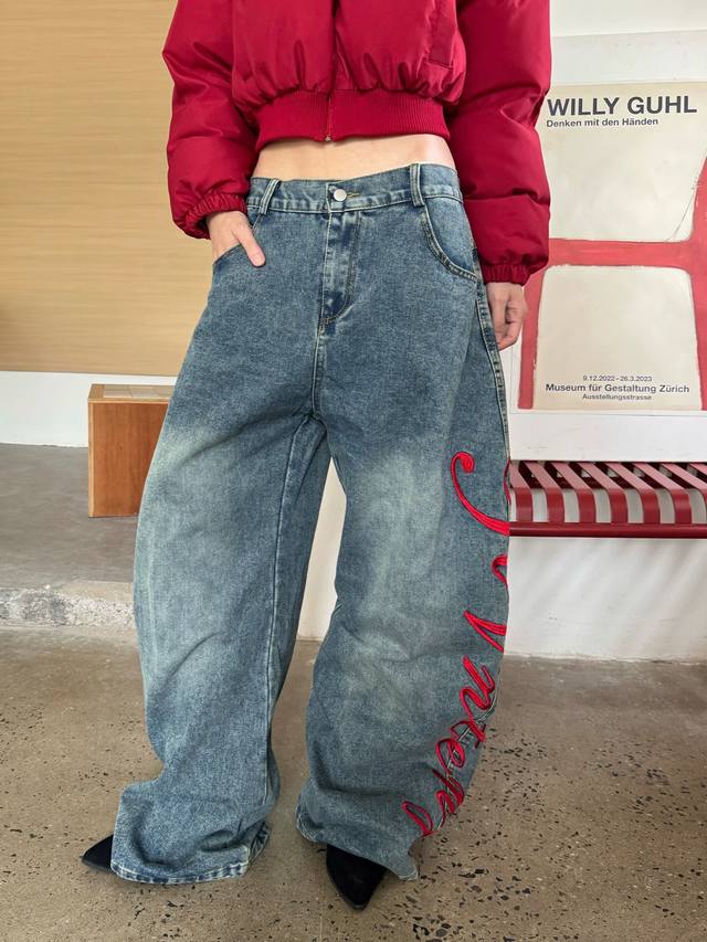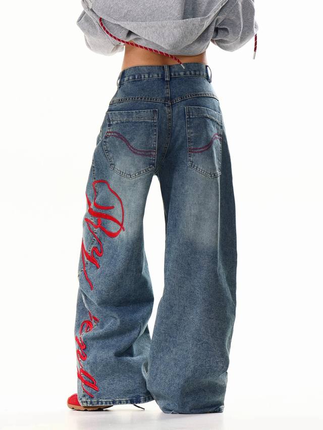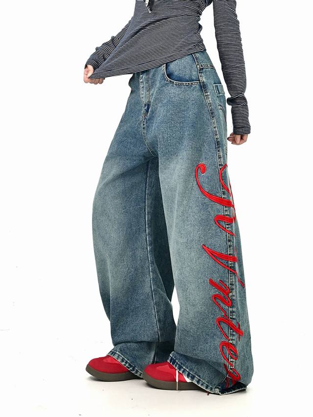 American Retro Letter Embroidery Washed Scimitar Jeans, unisex design, loose fit, casual, versatile, trendy sickle pants. Custom-made fabric undergoes top-notch high-quality washing, resulting in a dense texture, even color, and clear grain. Extremely comfortable to wear. The straight leg cut is flattering and slimming, suitable for all body types. A versatile and flattering choice for all seasons, perfect for both men and women. Also suitable for couples!