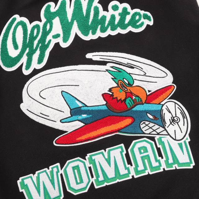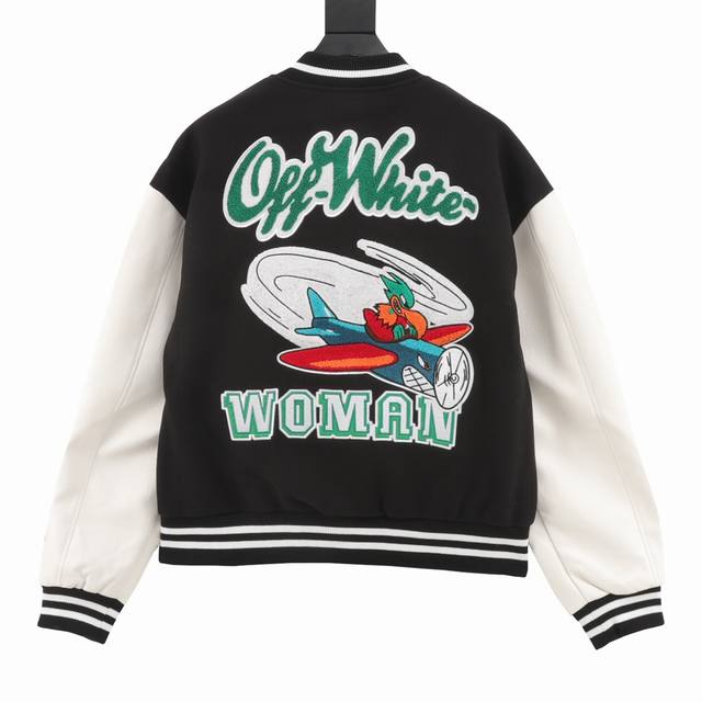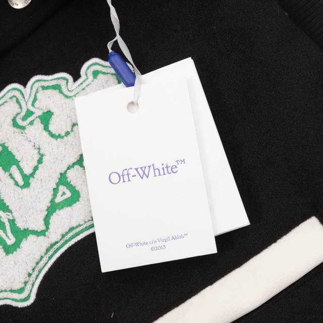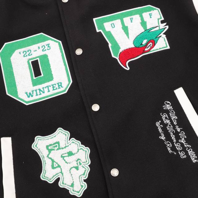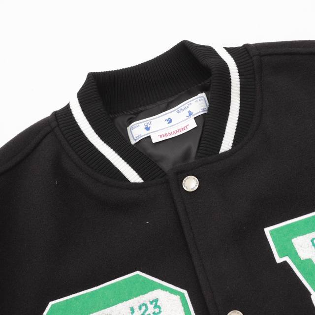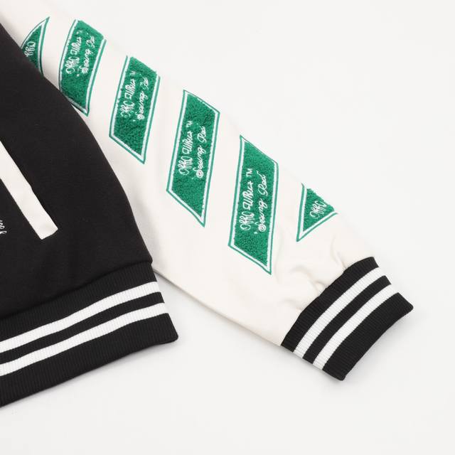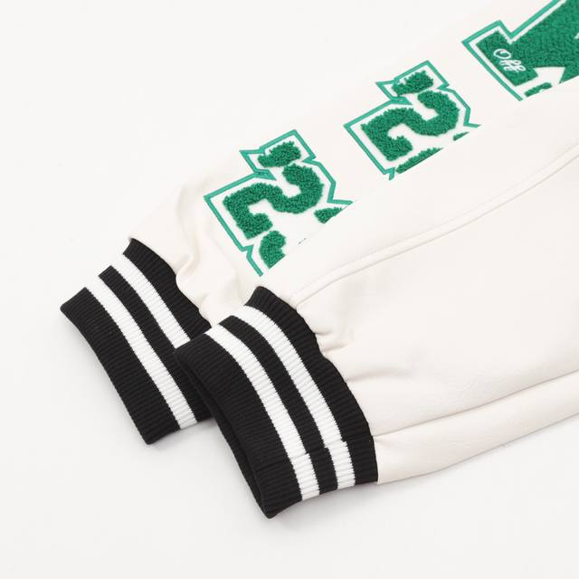 Style No. Y865 Ddd Off White Co Virgil 23Fw Fighter Jet Letter Baseball Jacket Ddd This jacket blends a wool body with leather sleeves, custom-woven and dyed high-elasticity ribbing, German imported flat knitting machine, custom-woven wool jacquard ribbing, and a skin-friendly, three-dimensional feel, injecting a fashionable trend into the classic silhouette. It uses imported PU leather with an unparalleled pleated texture; the hand-cutting and meticulous craftsmanship, especially the placement of the patchwork, are highly technical. The quality of the entire garment depends on this placement. Custom-made accessories, clear and perfect lettering, high-end and sophisticated. The entire garment is crafted with exclusive custom-made towel appliqu
