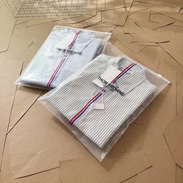Thom Browne. Tb summer short-sleeved shirt with blue stripes and gray stripes and double sleeve label short-sleeved