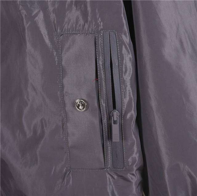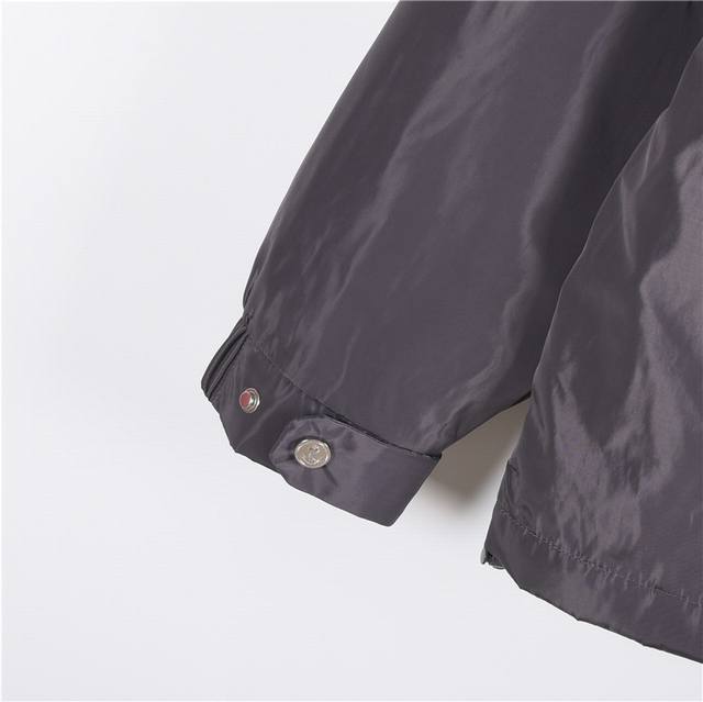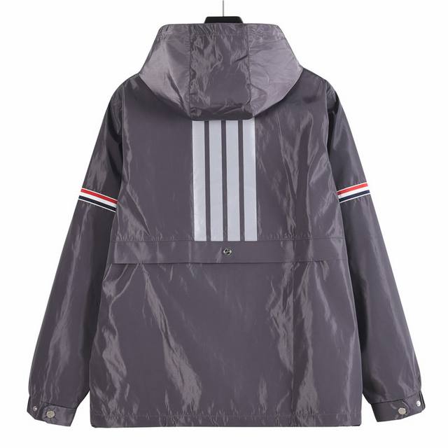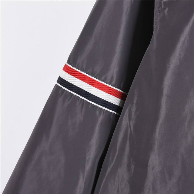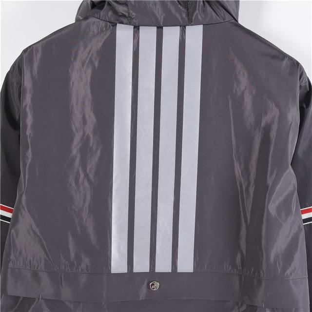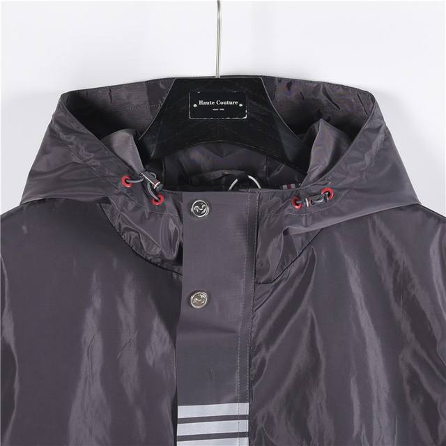 Tb windbreaker jacket with double sleeve labels and reflective four stripes. This Thom Browne jacket features double sleeve labels, is windproof and waterproof, and has reflective four stripes. The entire jacket uses a mature, high-strength heat-sealing process, making the stitching invisible and showcasing high-end technology. The entire production process is quite lengthy due to the meticulous attention to detail and quality. Reorder times are also long. The inner lining is made of Tb red, white, and blue striped fabric. It features original 1:1 replica buttons with the Tb logo. Made in Italy, the fabric is thick, waterproof, and custom-made. The buttons feature the Tb logo and custom-made hardware. The webbing is made using genuine Tb samples and is 2.5cm in red, white, and blue. High-end and sophisticated, the inner lining is entirely hand-stitched. The Tb label and square code label are made with imported herringbone stitching. Produced in our own brand factory using an assembly line, the workmanship ensures fine stitching and neat lines. A versatile and casual outerwear choice for spring and autumn