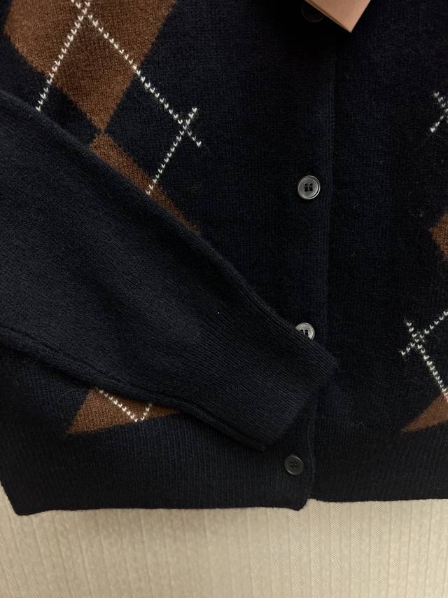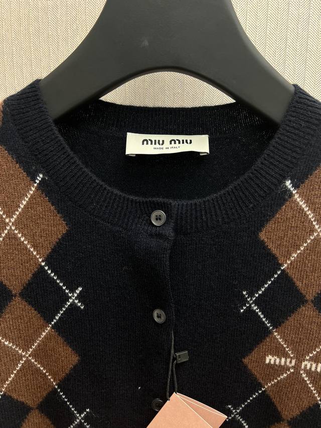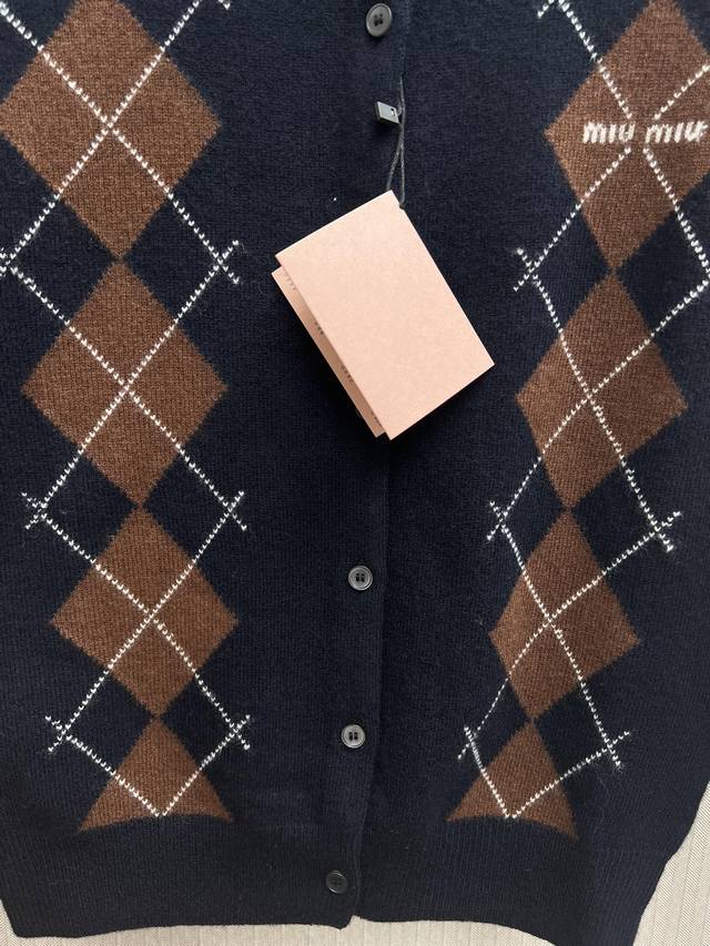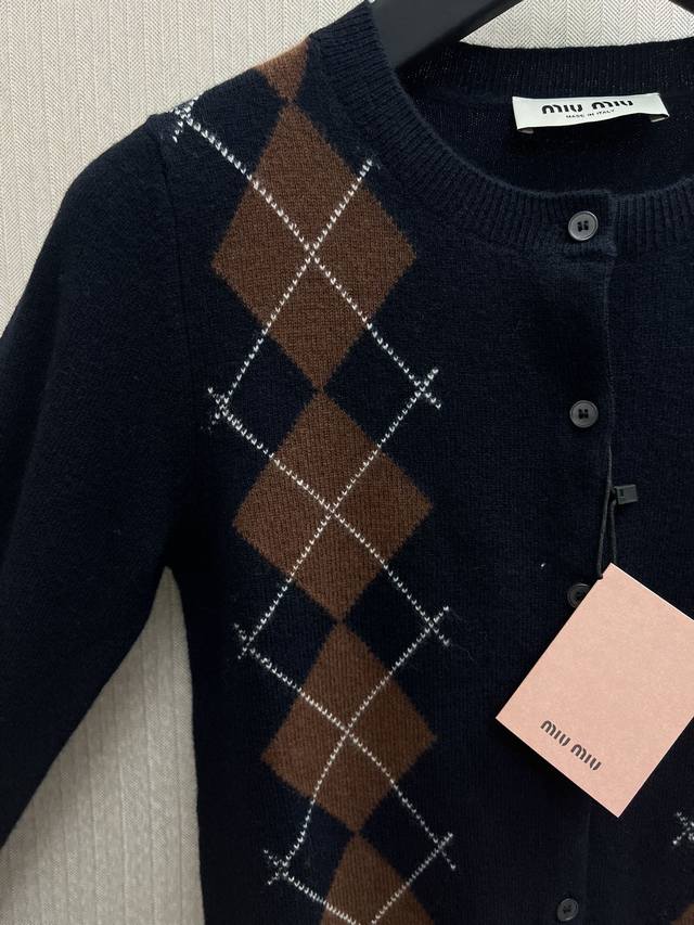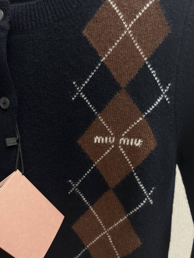 The new Miu Miu 25Ss diamond pattern adds a playful elegance to the exquisite craftsmanship of this soft cashmere button-down cardigan, reinterpreting a classic style with Miu Miu's sophisticated modern perspective. Sizes: S, M, L, DDD
