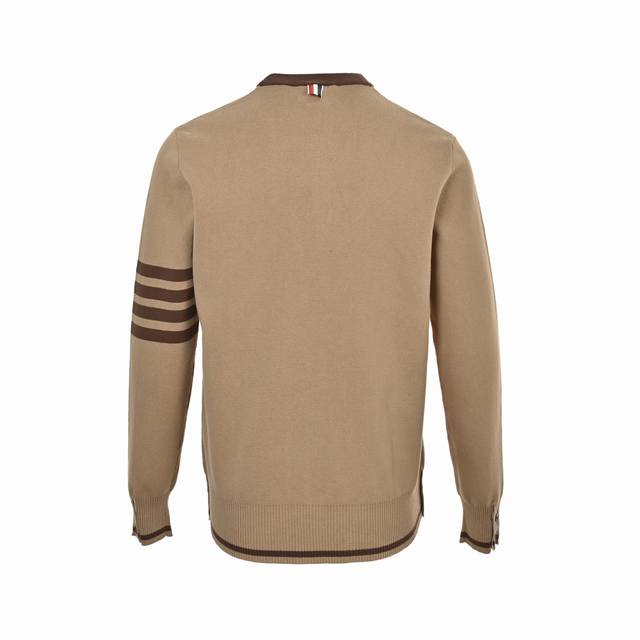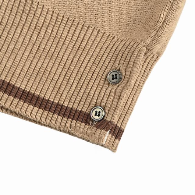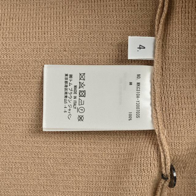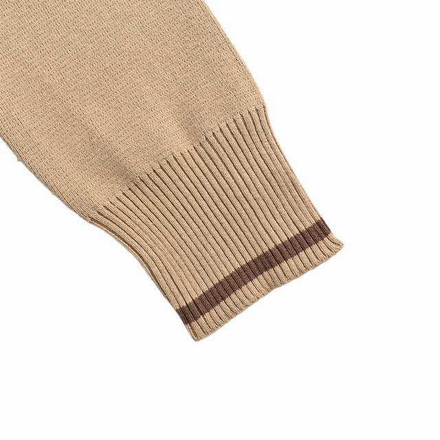 This piece is custom-dyed with 100% combed long-staple cotton using the original color-matched yarn. The weave is exceptionally complex, three times more than other weaves. It utilizes a four-hole stitch and undergoes a special treatment to create a firm and textured feel, durable, shape-resistant, and pilling-resistant, yet soft and warm. While a standard weave can produce three pieces, this one only produces half a piece. Made in Germany using the Stoll single-stitch system, the shoulder stitching creates a comfortable, flat, and seamless shoulder area. The flaps and door locks are secured with tight, flat tape to prevent deformation. The buttons are all crafted from natural deep-sea red-bottomed Tarot shells. Sizes: 1-4