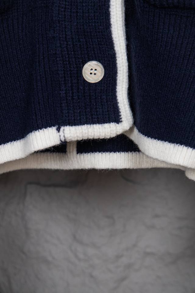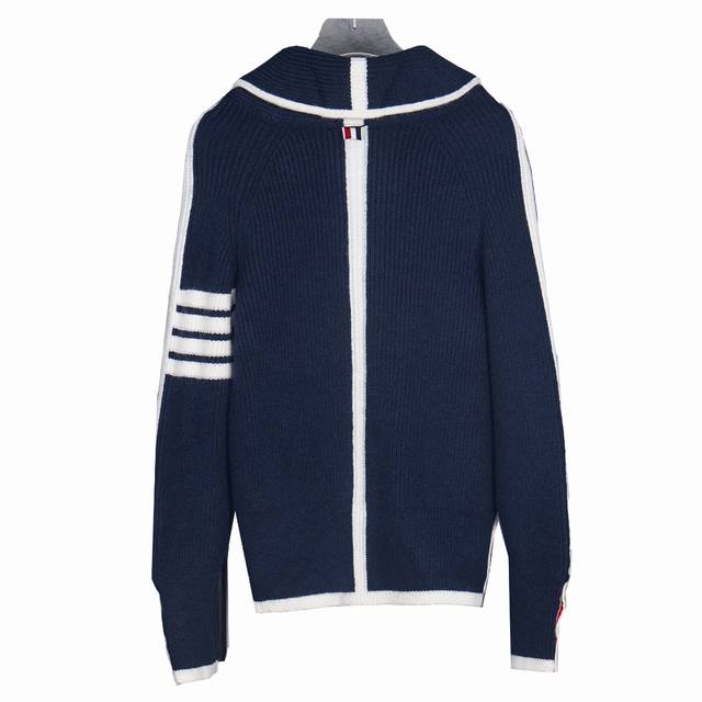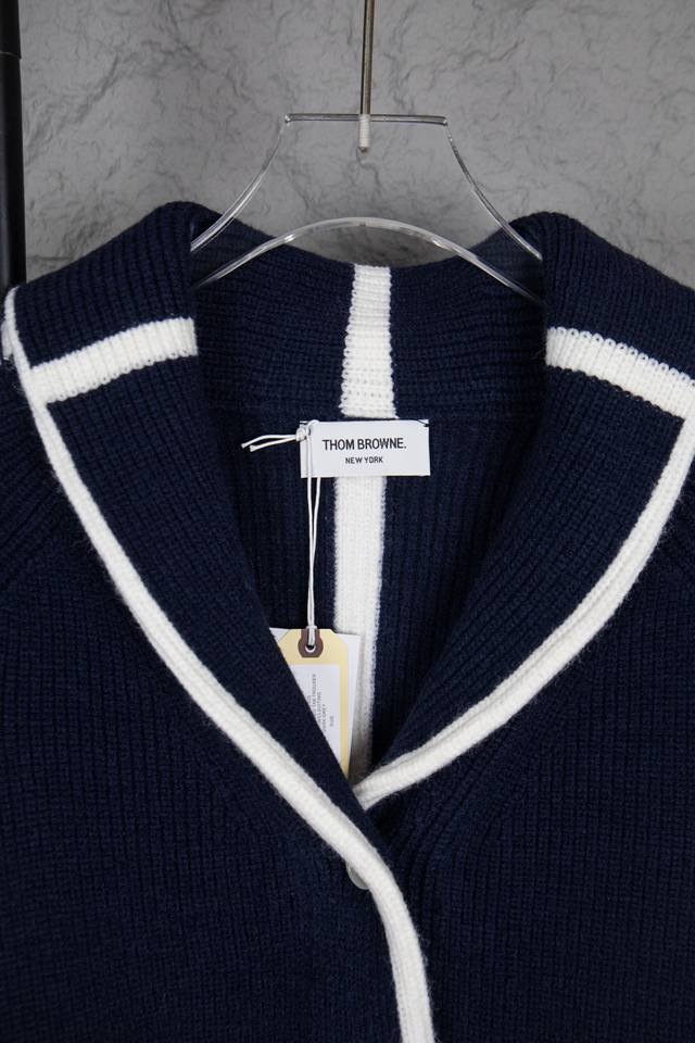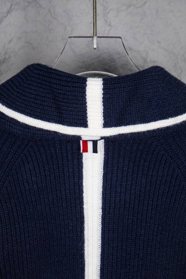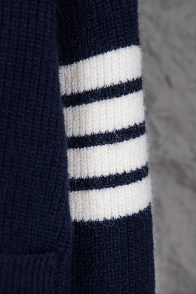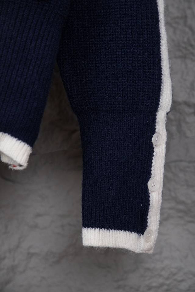 Thom Browne Classic Four-Bar Collar Wool Cardigan. Available simultaneously at official stores and online. Authentic order from a US trading company. Knitted on a 16-gauge Japanese Toyota flat knitting machine. Four-hole knit cuffs. Standard weight. Custom-supplied 36-count modal core-spun yarn from imported Turkish goat hair. 3-ply yarn composition: 68.8% wool, 18.5% anti-pilling fiber, 12.7% polyurethane fiber. Stylish and warm, very sophisticated! This simple yet classic style will never go out of fashion and pairs effortlessly with any item for a chic look! Do not tumble dry, machine washable at temperatures not exceeding 37