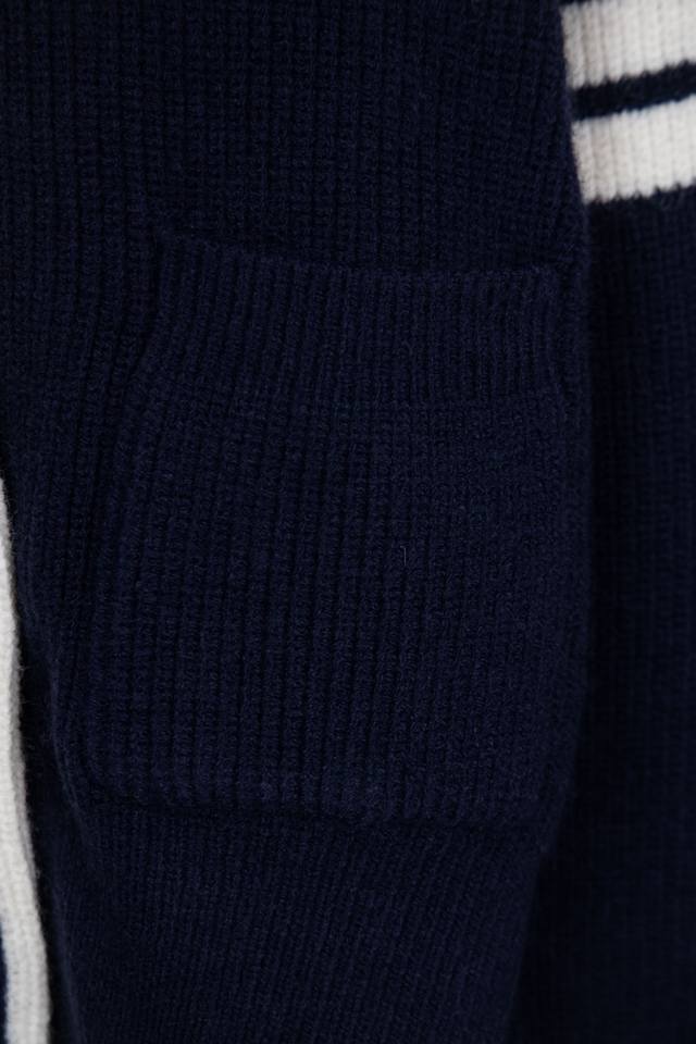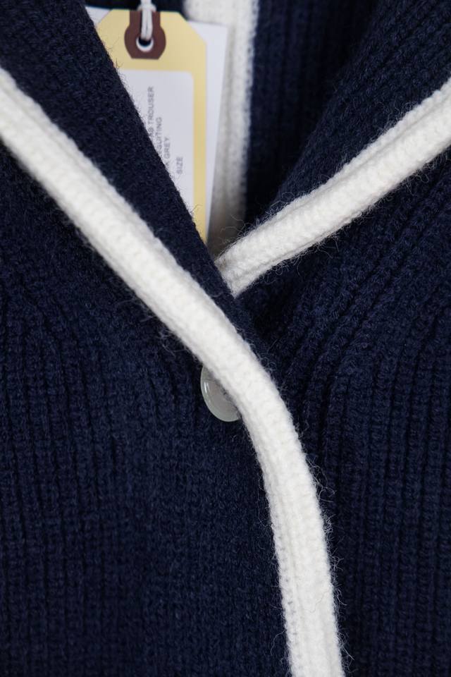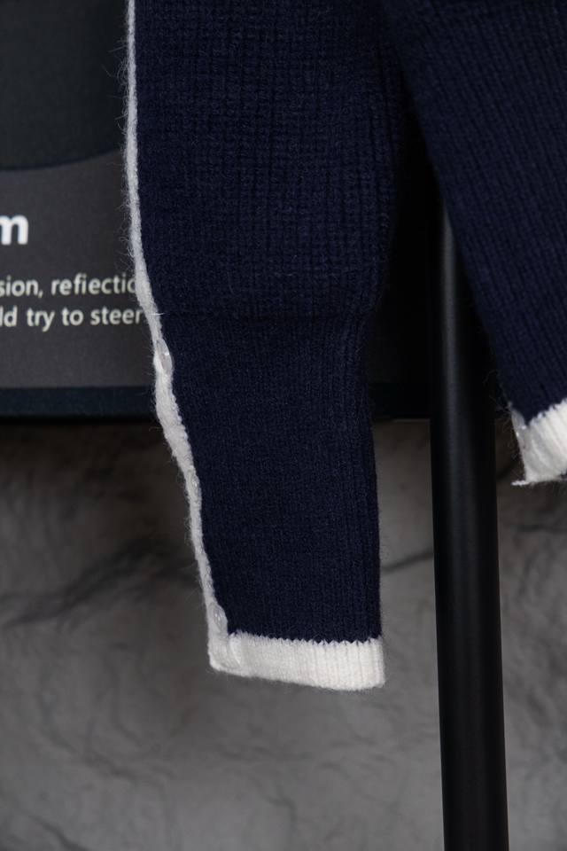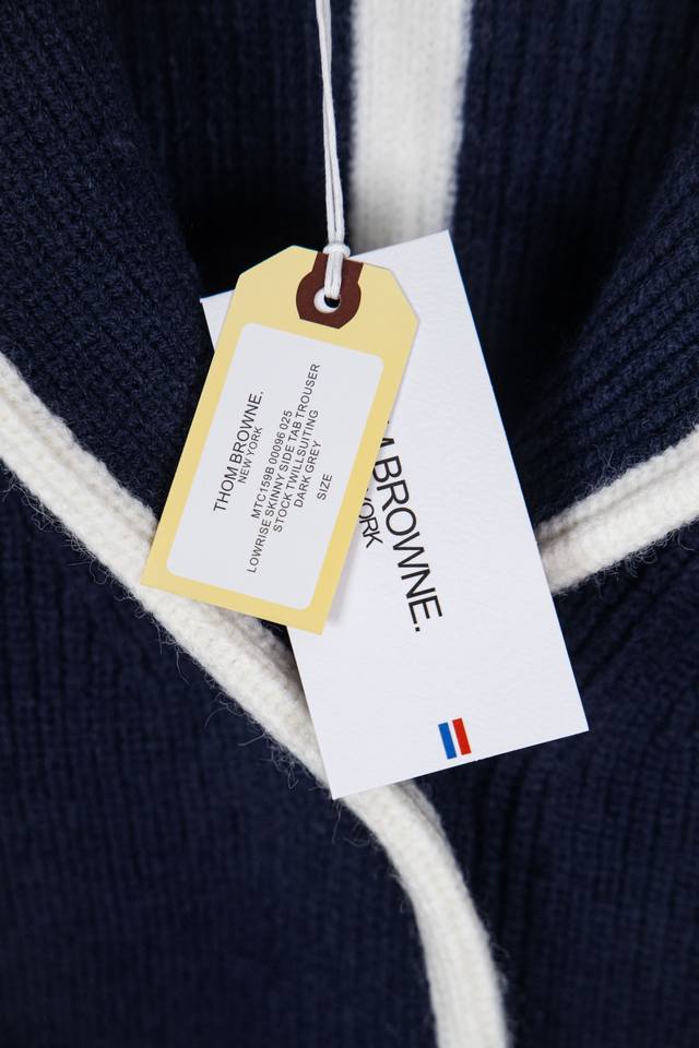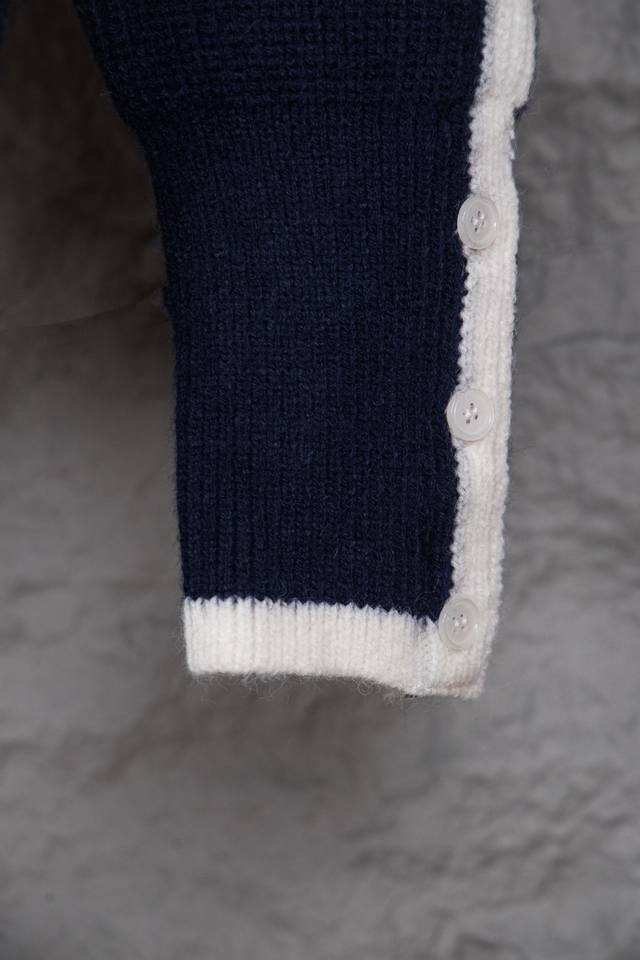 Thom Browne Classic Four-Bar Collar Wool Cardigan. Available simultaneously at official stores and online. Authentic order from a US trading company. Knitted on a 16-gauge Japanese Toyota flat knitting machine. Four-hole knit cuffs. Standard weight. Custom-supplied 36-count modal core-spun yarn from imported Turkish goat hair. 3-ply yarn composition: 68.8% wool, 18.5% anti-pilling fiber, 12.7% polyurethane fiber. Stylish and warm, very sophisticated! This simple yet classic style will never go out of fashion and pairs effortlessly with any item for a chic look! Do not tumble dry, machine washable at temperatures not exceeding 37