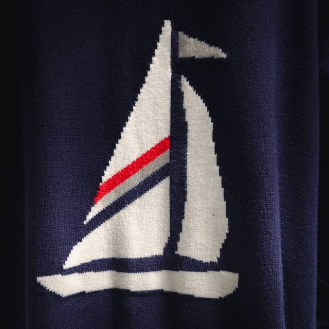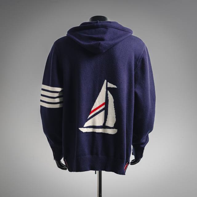 Thom Browne sailboat pattern zip-up cardigan, four-stripe wool blend sweater. Made of wool blend, featuring a Tb logo zipper pull. Soft and comfortable, produced using imported Japanese automatic knitting machines with tight stitches. Sleeves are knitted with four stripes. Buttons are made of natural shell. Fits both slim and loose, comfortable and breathable. Unisex style. All tags and labels included. Colors: Navy blue, Gray. Sizes: 1 2 3 4.
