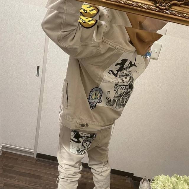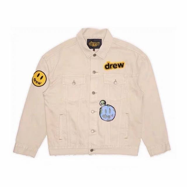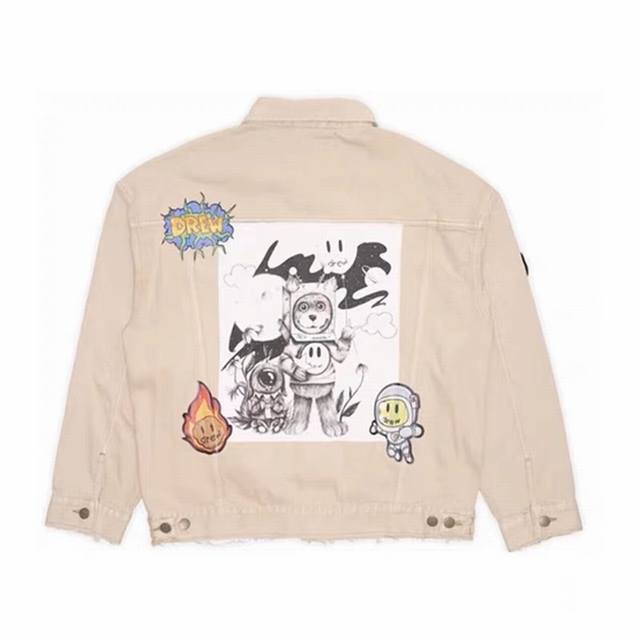 -Drew House 23Fw Smiley face multi-element alien badge mosaic illustration denim jacket Drew alien jacket -