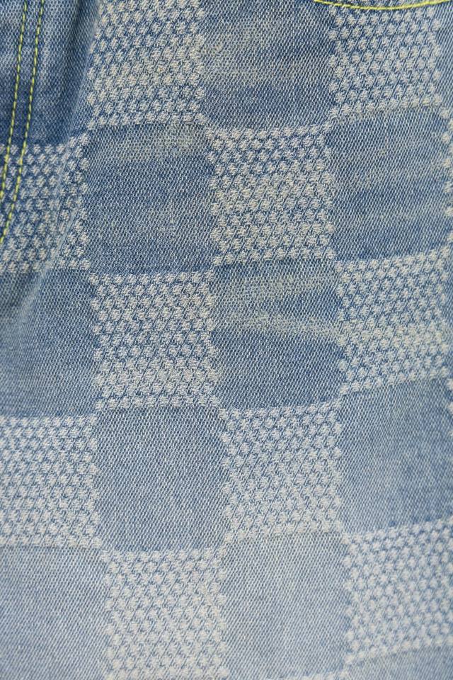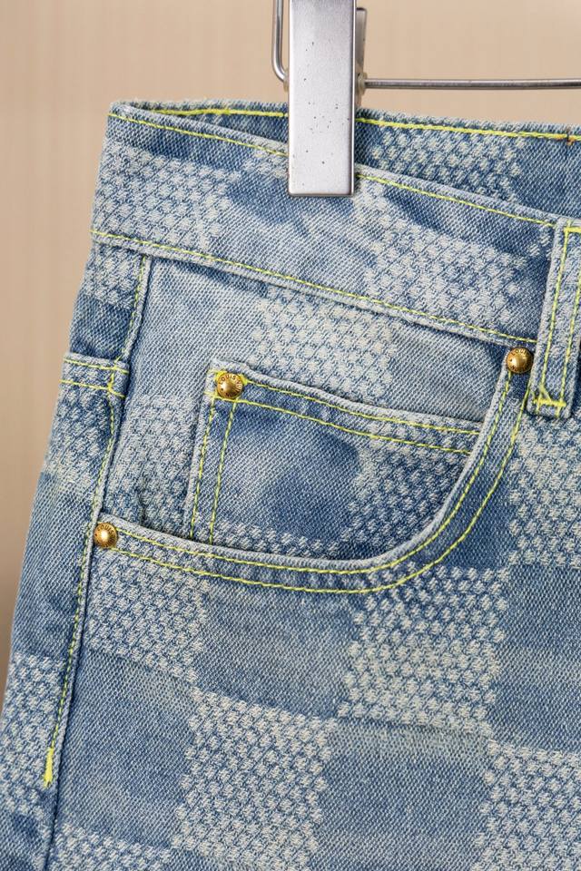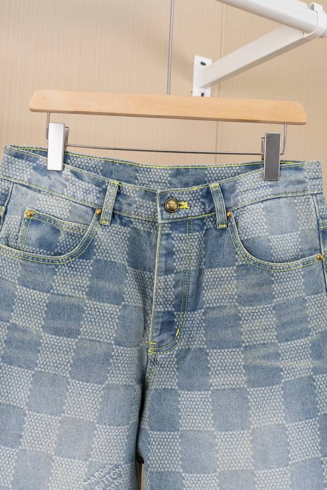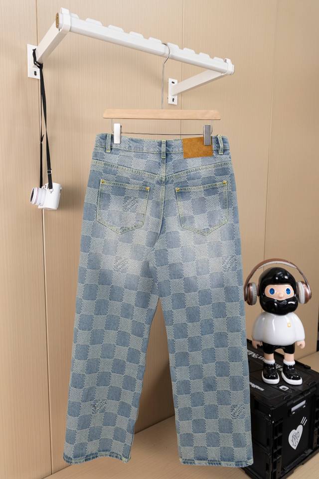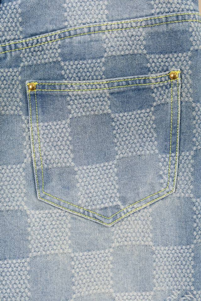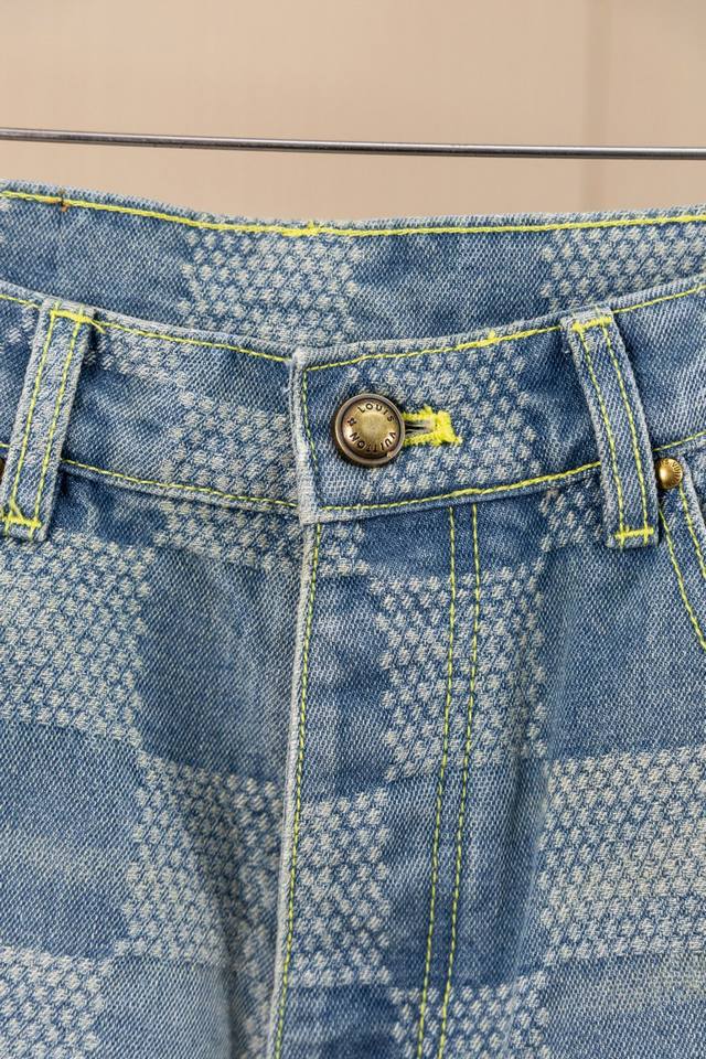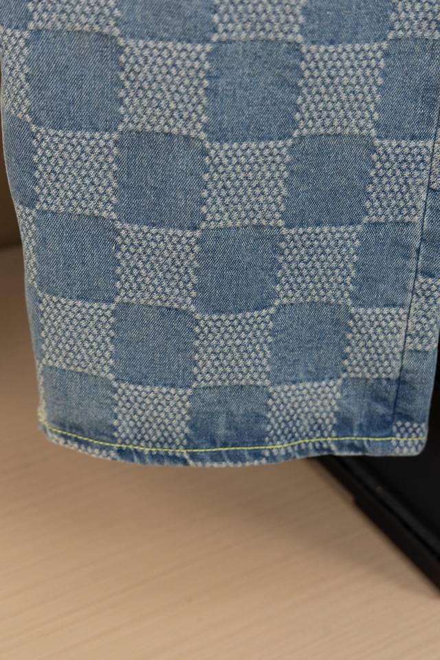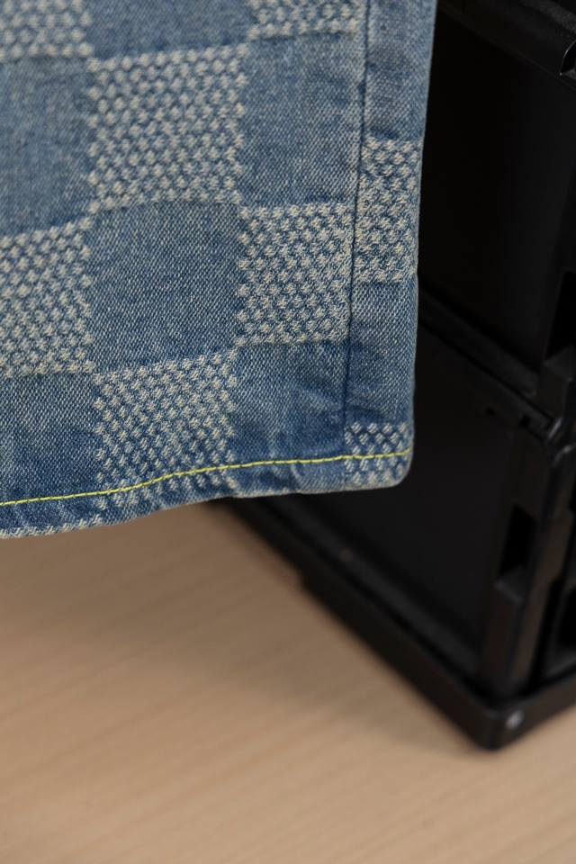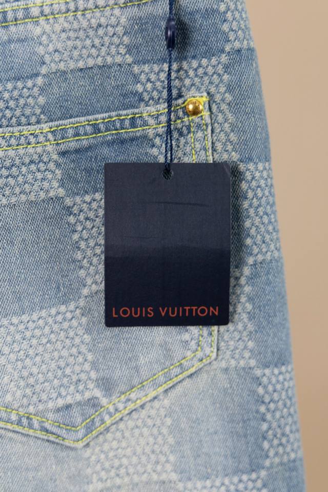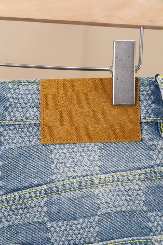 1V25Ss checkerboard straight-leg jeans for P40,600. They feature a straight-leg fit, custom-woven checkerboard jacquard denim, a classic checkered pattern woven with 3D jacquard technology. The denim is sand-washed, bleached, and distressed, creating a bleached and distressed effect. The threshold buttons feature a new pearl button closure, and the rear is embellished with the new Damier label. Custom-made checkered and counter-point stitching is included, and the jeans come with a full set of new trims.
