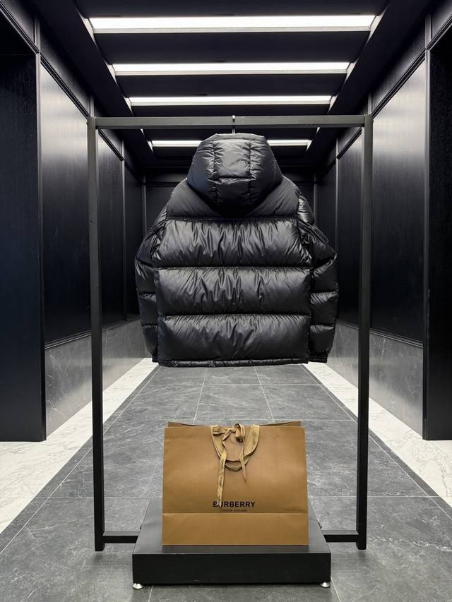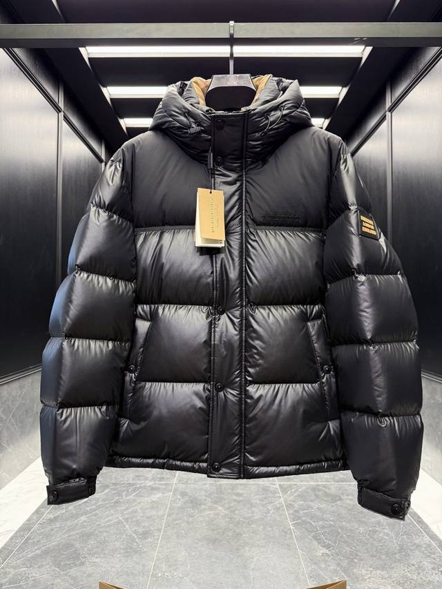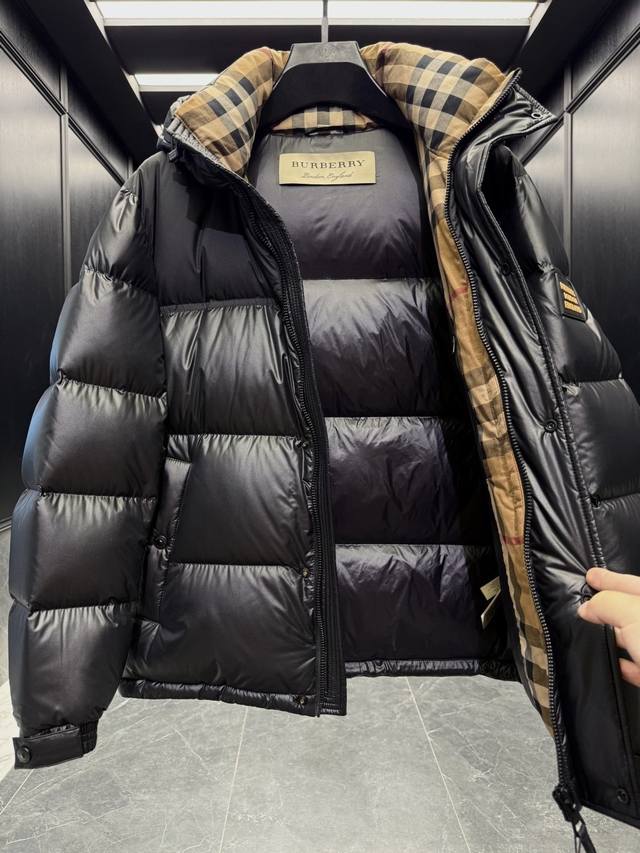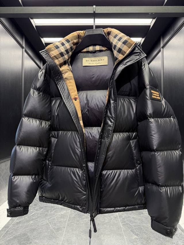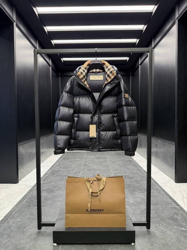 Burber* color-blocked hooded down jacket with logo and lettering. Features a classic checkered lining. Absolutely stunning when worn. Premium goose down filling. Super full and luxurious. Highly recommended by