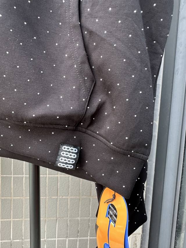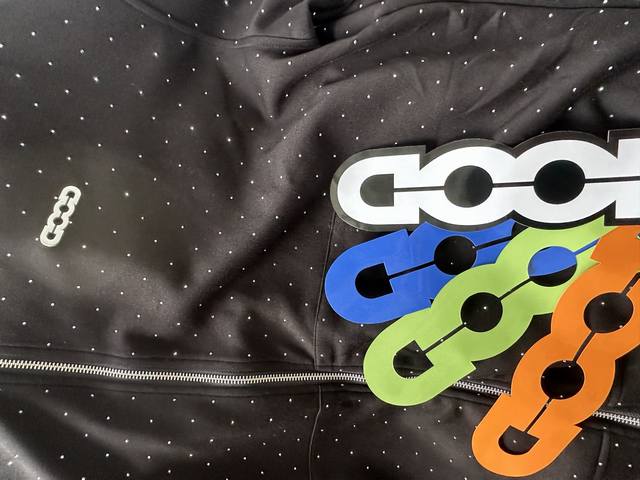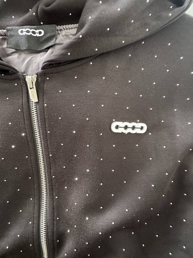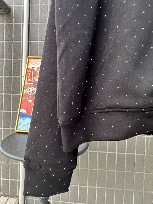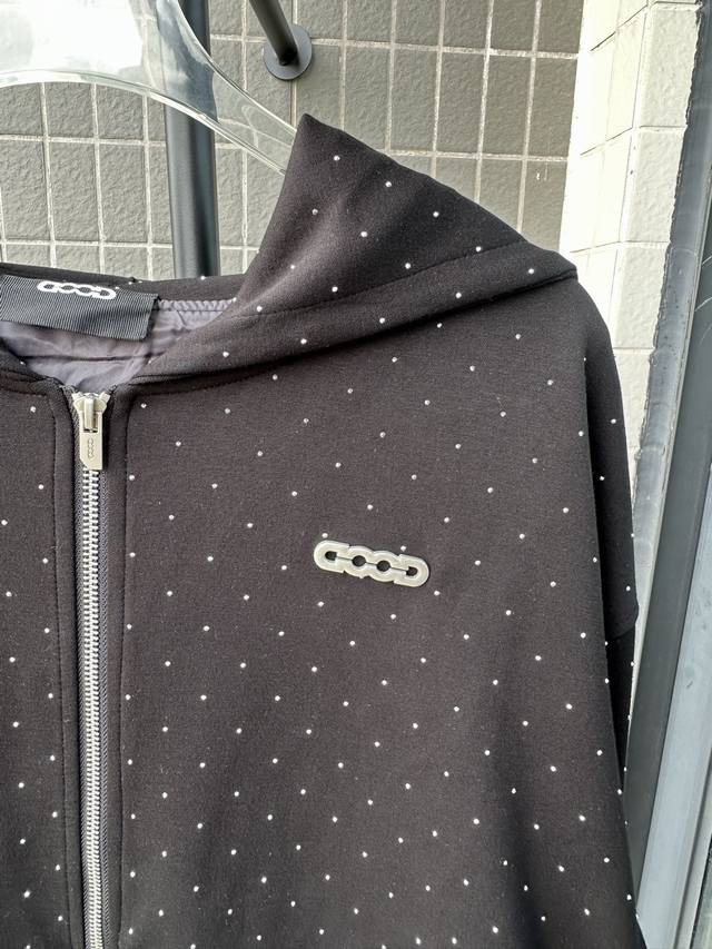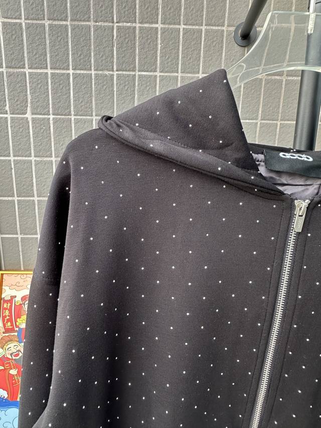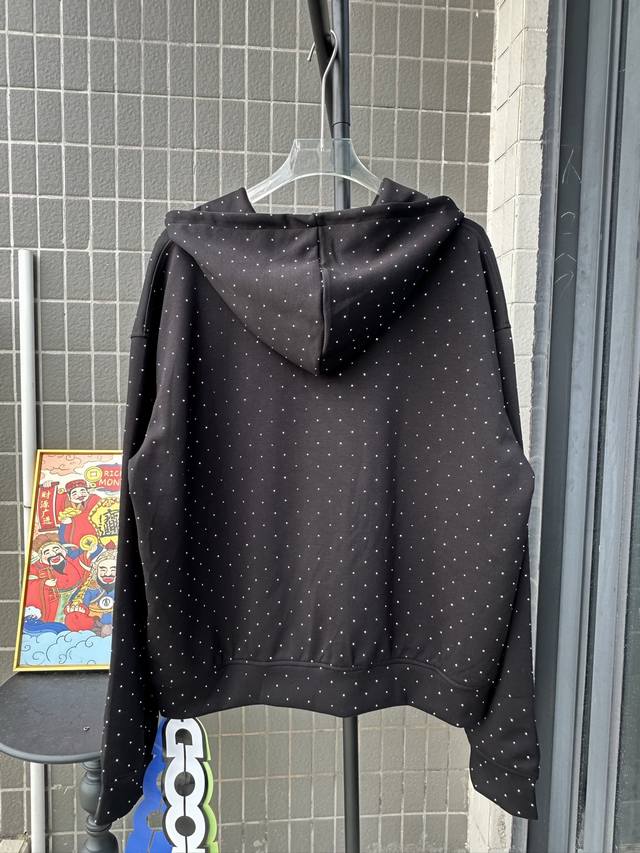 Top-tier version, different from common goods. Style number: Tt101. Goodbrand shimmering silver starry sky rhinestone zip-up hoodie. Unisex, same details as official website, complete packaging, three labels, and moisture-proof paper. Different from common market goods, feel free to compare. Fabric uses 420g composite outer layer ultra-soft polyester fiber process, inner layer delicate and soft, stylish appearance, smooth drape. Size Os fit, can fit up to 200 catties without pressure, comfortable and stylish. Colors: Black/Grey. Sizes: S-XL.