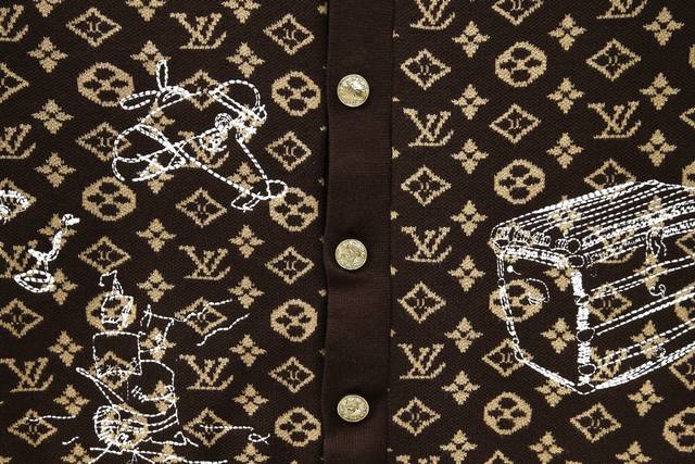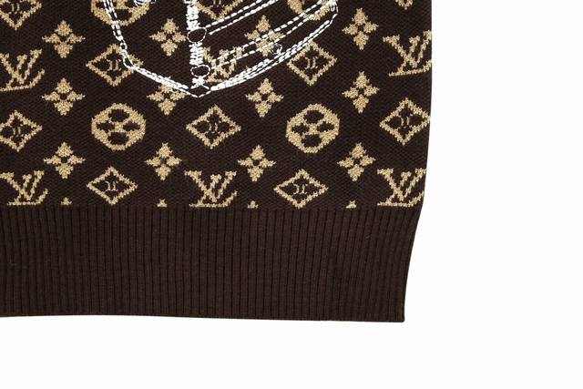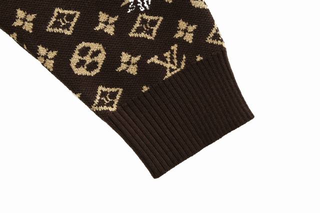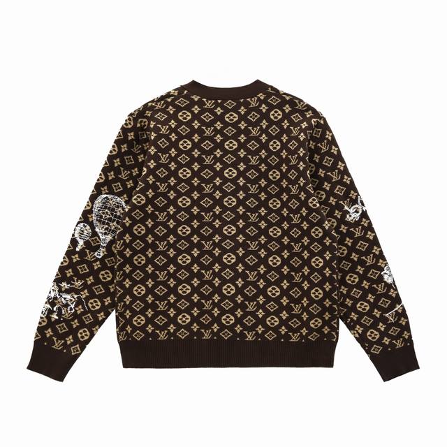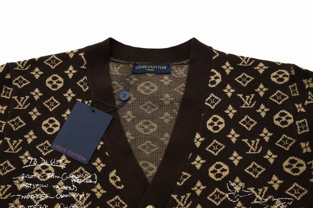 V Fw New Monogram Embroidered Graffiti Floral Wool Knit Cardigan Sweater. This knit sweater is made from soft wool, with rich colors adding warmth to cold weather. The full Monogram jacquard pattern complements the embroidered Doodles pattern from the Fall/Winter 2023 runway show! The texture is delicate and soft, the sweater has a substantial feel, is thick, breathable, and comfortable! The overall look is clean and refreshing. Perfect for the current season, it's youthful, stylish, and energetic. Brown, unisex! Sizes: Xs-L