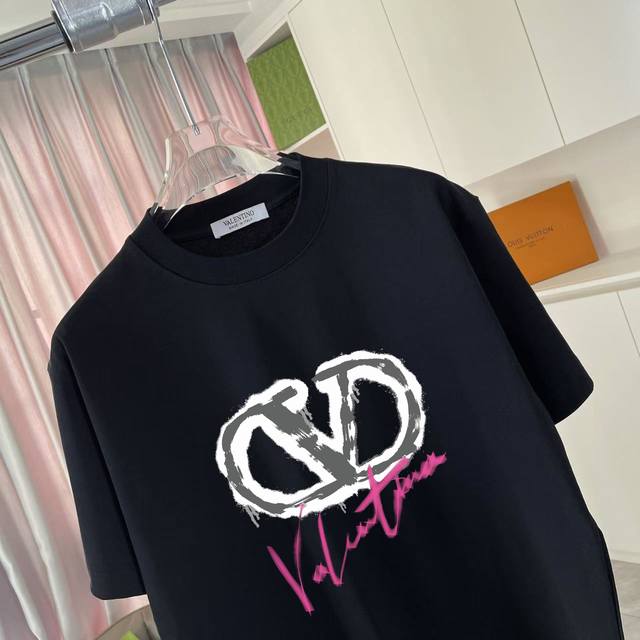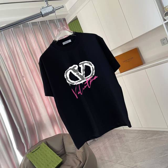 Valentin 2025 Autumn New Style Personalized Letter Logo Print Custom Fabric 300G Short Sleeve T-Shirt Unisex Sizes: SML XL Colors: Black, White, Lake Green, Purple