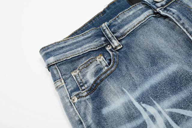 Washed by a large factory Full of high-end feeling Knee part destruction design with patchwork leather design has been used as the facade design Leather waist nameplate The focus of this model is not on washing, but on the shape of the destruction and the pattern The secret lies in the craftsmanship of the master. The cost of handmade products such as wear, monkey, knife cutting, etc. is far beyond the comparison of assembly line products