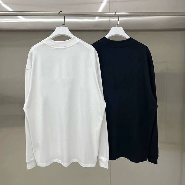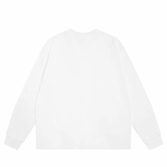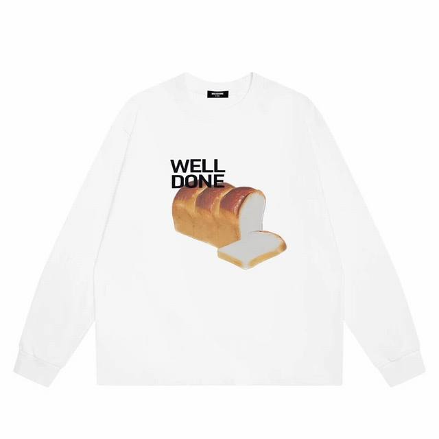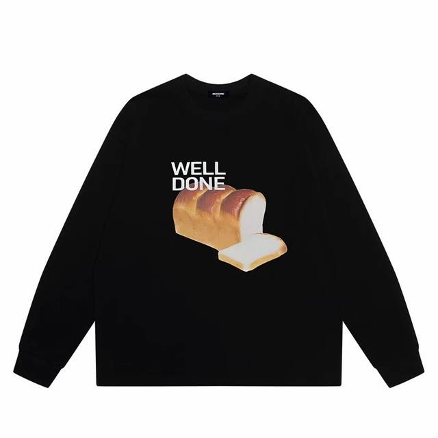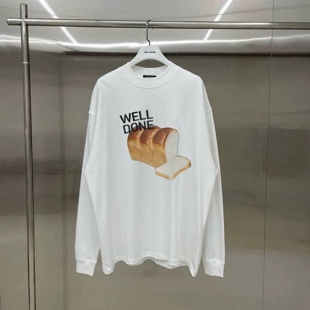 We11Done Bread Print Loose Crew Neck Long Sleeve T-Shirt, Unisex Couple Style. Fabric: Original Custom 300G Washed Parisian Cotton. Craftsmanship: All stitching is three-thread sewn throughout, with the back collar webbing extending to the shoulder for reinforcement. The seams at the details and shoulders are backstitched for a more seamless finish. Custom original PU leather label; the print uses high-end technology to prevent cracking, unlike ordinary prints on the market. Accessories: Hangtag, washing label, and a full set of custom-made Yuan-version accessories. Colors: White, Black. Sizes: S, L. Shoulder Width, Chest, Length. S: 52 x 112 x 74 mm; M: 53 x 118 x 77 mm; L: 54 x 124 x 80 mm.