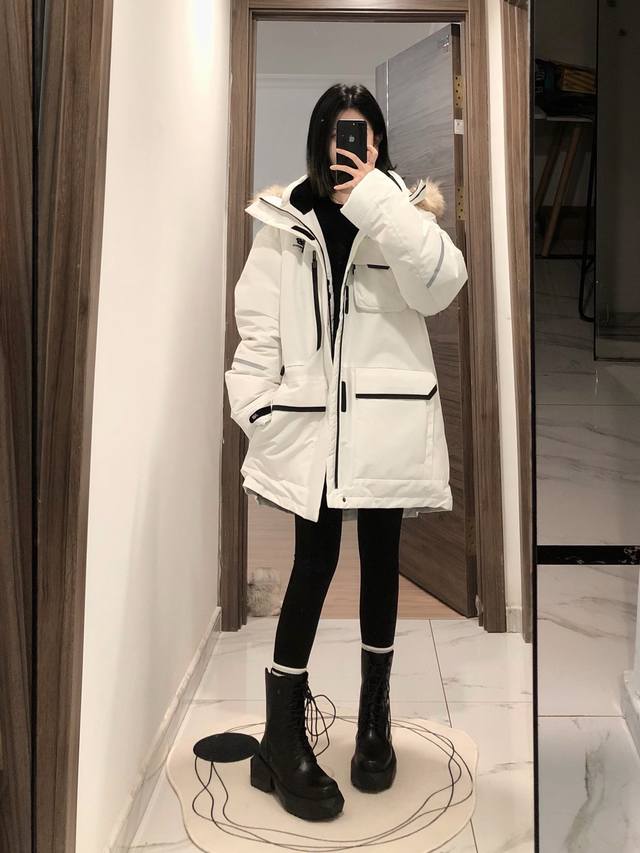 New Balance Solid Color Hooded Down Jacket with Fur Collar Filling: 90% white duck down, with full down clusters and a down content of up to 90%, giving the down jacket exceptional warmth. The down fibers trap a large amount of still air, forming a natural insulation barrier, effectively reducing heat conduction and locking warmth inside the jacket, allowing you to feel the warmth of spring sunshine even in freezing weather. Fur Collar: An oversized fur collar surrounds the neckline; the soft, smooth fur feels like a gentle breeze against your face. It's not just a stylish decoration, but also a powerful warmth-keeping tool, effectively blocking cold wind from entering through the neck, adding to overall warmth. Materials: The chest pocket uses magnetic buttons for convenient and silent opening and closing. The magnetic force is just right; a gentle touch secures the closure, avoiding the inconvenience of traditional buttons and the jamming of zippers. Ample pocket space for convenient storage of small personal items such as phones and cards, readily accessible and practical. Features: A unique detachable design meets diverse needs. The fur collar or pockets can be easily removed to suit different moods and occasions, instantly switching styles. Whether for a casual, stylish look or a sleek, athletic outdoor adventure, it perfectly adapts to showcase your multifaceted charm. This down jacket combines functionality and style, making it an ideal choice for warding off the winter chill. Color: Black/Off-white. Size: M-XL. Chest: 123/127/131/135 cm. Shoulder Width: 53.7/54.9/56.1/57.3 cm. Length: 81.5/83.5/85.5/57.5 cm. Sleeve Length: 64.5/65.5/66.5/67.5 cm.