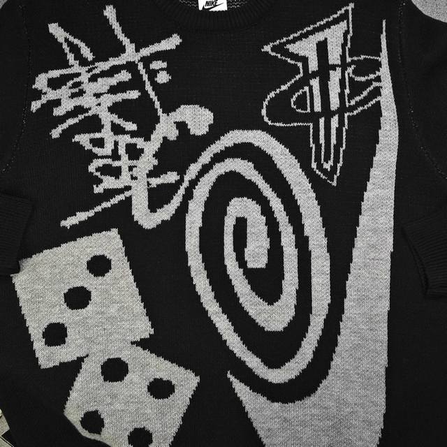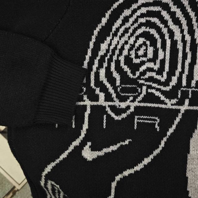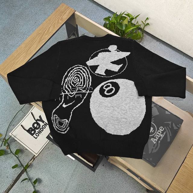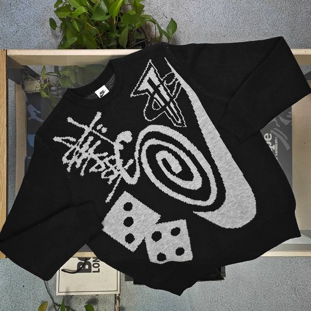2025 Autumn/Winter Stussynike x Nike Mosquito Coil Dice Billiards Logo Jacquard Couple Loose Knit Crew Neck Sweater. Made with original 100% wool fabric and custom-made yarn, this versatile sweater is of high quality, pill-resistant, and available in smaller sizes (over 600g). A must-have for autumn and winter, perfect for layering or wearing alone! Made with ultra-high weight custom-grade wool blend and custom-woven high-weight yarn, the seams feature hand-made, original-quality trim. Excellent drape and a well-fitting design with meticulous details! The large, all-over jacquard lettering echoes the design, creating a striking color contrast and embodying Stussy's brand culture. The continuous pattern, extending from the sleeves to the body, is visually impactful, showcasing a rebellious street style with an exaggerated fashion flair. Perfect for wearing alone or as an inner layer, it highlights the Stussy trend and is an essential winter staple. Unisex! Color: Black Sizes: S-XL Length, Chest, Sleeve Length, Shoulder Width S 64 116 62 43 M 66 64 44 L 68 124 66 45 XL 70 128 68 46